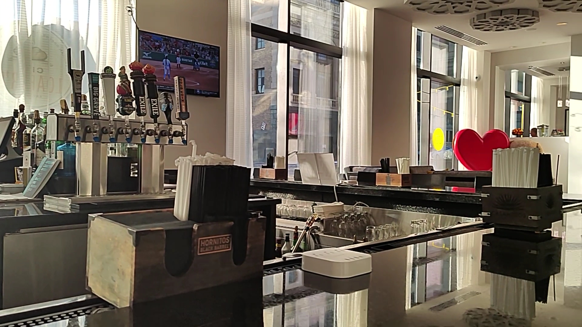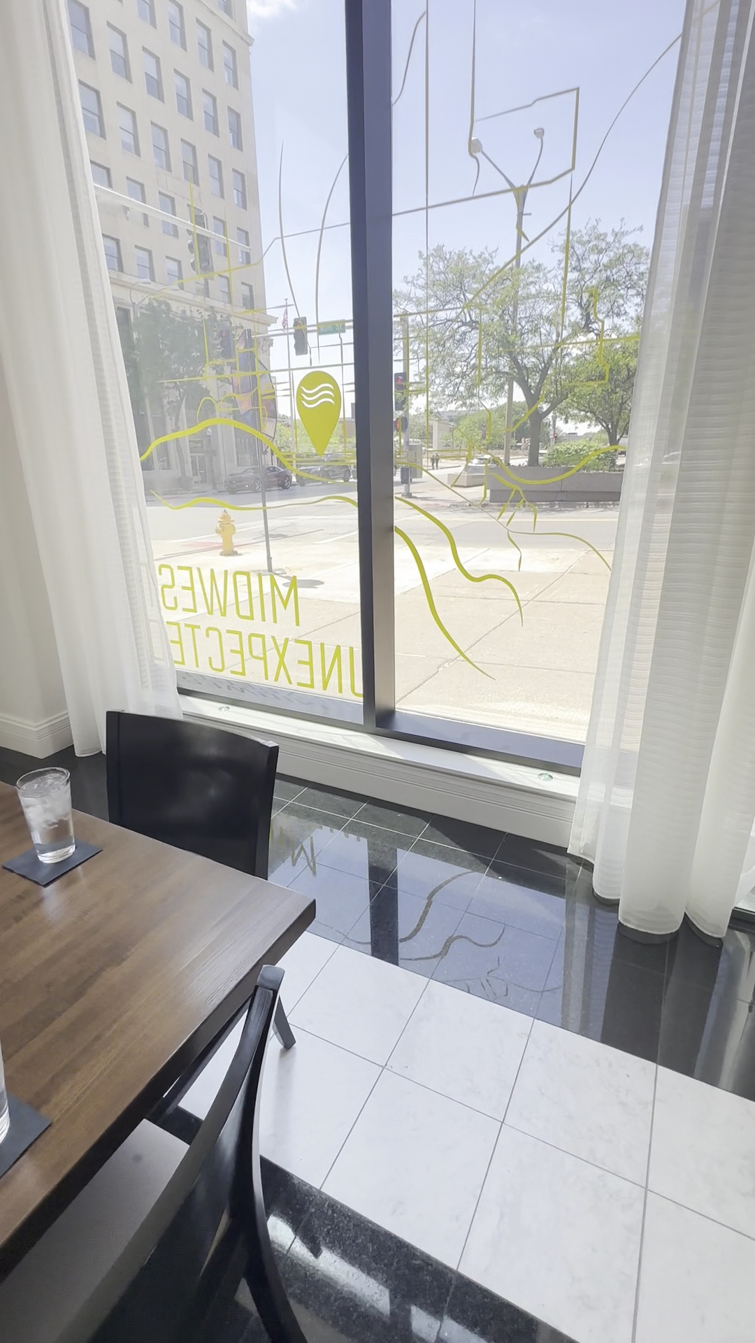 I didn't realize it from the internet or even from the storefront, but this place is inside a hotel - The Current Iowa. They have a nice looking lobby/dining space, too! Black and white polished marble/tile lines the entire floor. There are interesting decorative features throughout, including some suspended cocoon-type glass sculpture and various pictures/paintings in the space that add character to what would otherwise be a fairly sterile hotel lounge. Lighting is supplied by a combination of recessed fixtures in the ceiling, suspended chandeliers stylized to look like they have inverted electric tea lights, bulbs in a large drop ceiling featured above the bar, and ample natural light from the large windows along the entire space. It all comes together to look modern, but feels very warm.