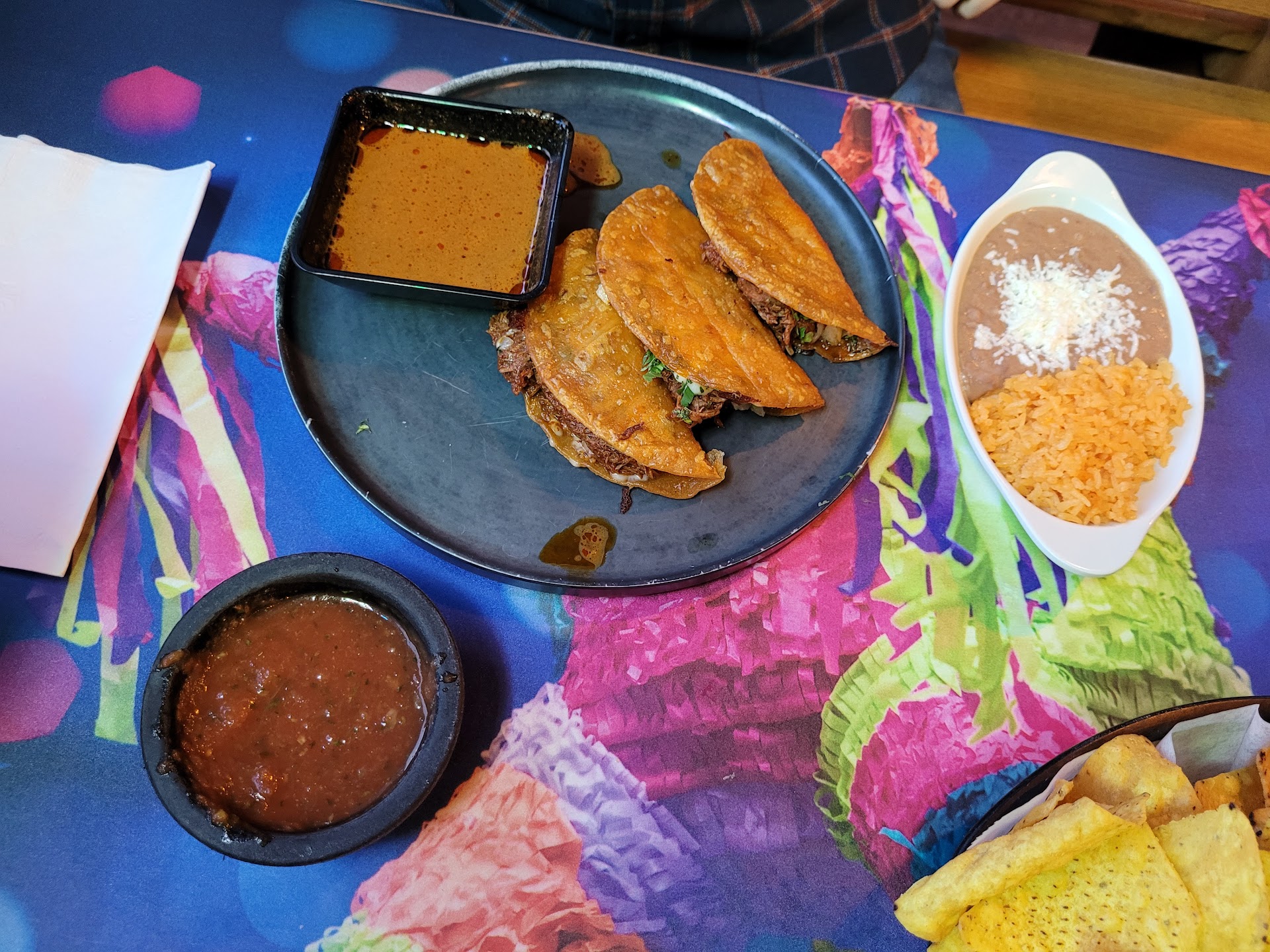 Read moreHad date night here, first time visiting and probably the last. Let me refine the "fusion" description: this is a Mexican restaurant with a menu and atmosphere designed for gringos and basic palettes -this is Midwest-ixcan, think Taco Johns. I ordered the steak and mushrooms which came with rice and beans. The steak was overcooked and chewy, mushrooms and onions were sparse and the plate was LOADED with salty queso co-mingled with meat grease. The refried beans had no taste, same with the rice, the tortillas were wrapped in foil and placed on top of the entree which left the foil covered in queso as well. My partner had a 3-piece combination, said the chorizo and potatoes were "meh" and the beef was acceptable, we both agreed the rice and beans were paltry. Neither of us finished our entrees or took leftovers. I see this place being a banger for people who think bell peppers are spicy and Coronas are exotic. The booths were pretty uncomfortable also, my cheeks were aching by the time the food came. I had a Genuine Margarita which I enjoyed for its tartness but it wasn't worth $12. I diverged from my favorite Mexican joint (Costa Del Mar), fooled around and found out. *I will say our waitress was a lovely young lady who took care of us regardless of the quality of our meal, she was a real one and...