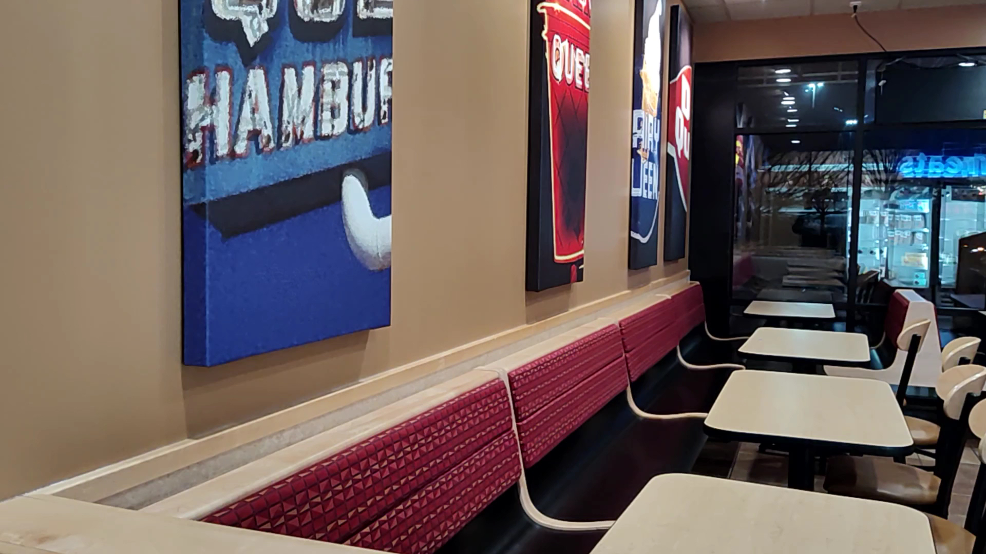 This particular Dairy Queen has only been here since 2019. The newness shows - all the booths and tables are still very clean and not worn in the least. 1 foot square ceramic tile floors of a variety of beige/brown fill the space, inviting the eyes upward. I guess looking up there's not much more to really take in - the lighting is a combination of recessed fixtures in the 2 foot square drop ceiling and several red glass suspended fixtures in the center of the space. Large light tan tile lines one wall, with a bright blue tile of the same size along the wall containing the refrigerators with the ice cream cakes. Light pop from the 80s to current offerings played throughout the visit. I can't really criticize at all; everything functions well and comes together to say "I'm a franchise ice cream shop". There's a certain comfort to it all.