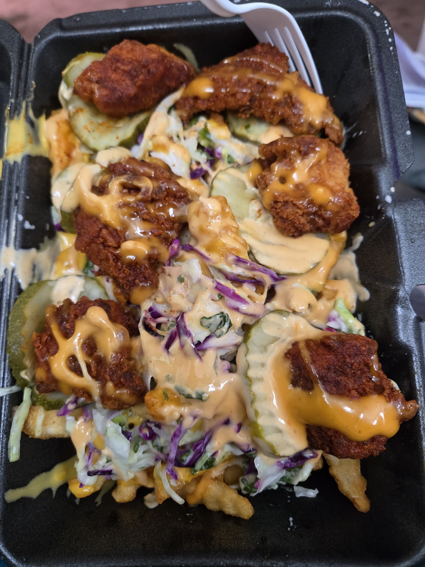 Ā Ā Ā Read moreI have a couple "gripes" about this place. And 1 star reviews are not my usual thing, so hear me out. The chicken was so so soooo bitter. Almost tasted soapy type of bitter. It was just a chicken tender with pure chili powder on it. No salt, no other seasonings present. This was confirmed by the neon red it dyed my fingers after picking it up for one bite.