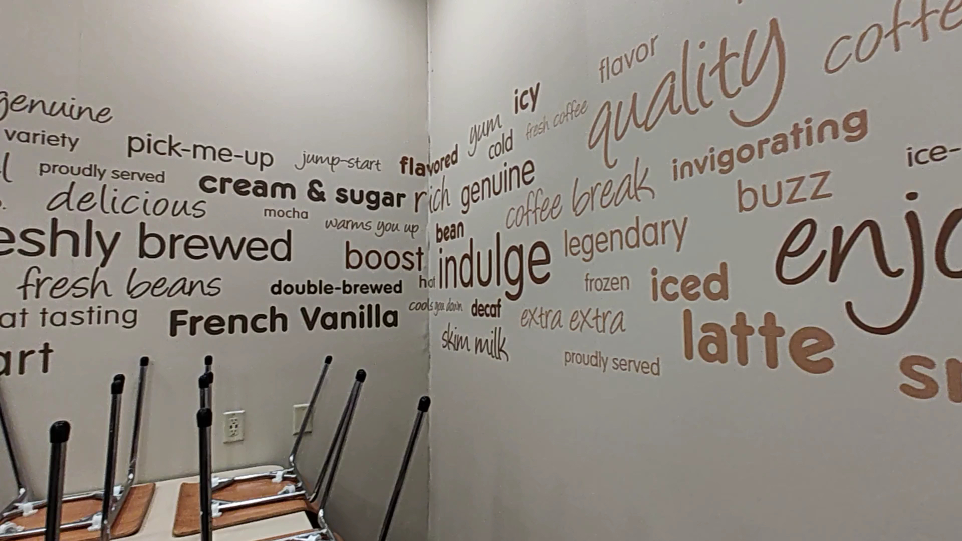 From the Dunkin' locations I've been to in the Quad Cities, this one does many of the same things. That is to say, they offer pretty much the same food and beverages and contain about 90% of the same fixtures and design. The walls are neutral brown or beige, the same skinny yellow cone light fixtures are suspended throughout the space, and there's a display of their bagged coffee at one end of the dining room. The overhead has a pretty standard drop ceiling with fluorescent lights throughout as well.