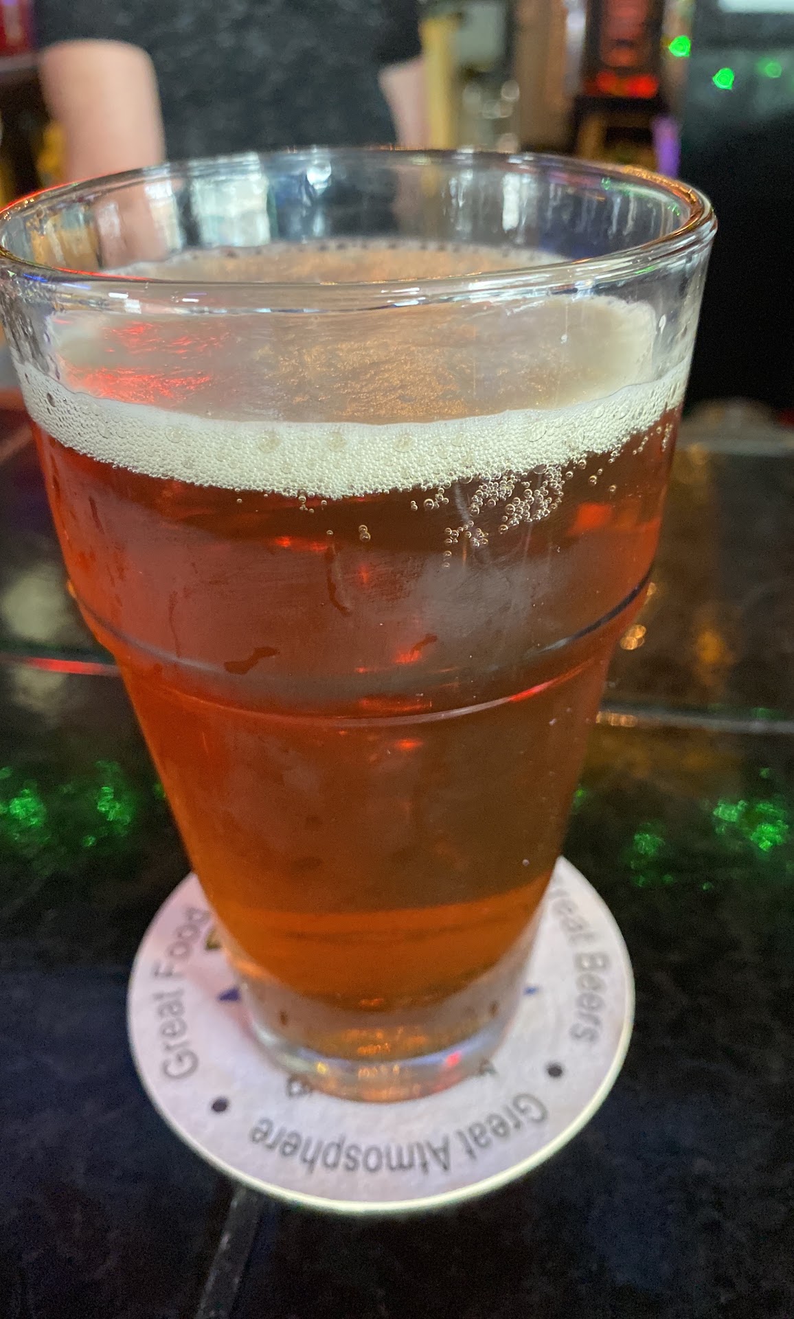 The interior is not exactly what I was inspecting. The bar and bar stools seemed really new, especially the stools - leather or a close approximation, very comfortable! The floors were mostly covered with a newish looking 1-foot square light ceramic tile, while the ceiling was solid and painted red. Lighting was provided by a combination of suspended fixtures and string lights above the bar, in addition to the neon beer signs and natural light through the windows and doors. The place has all the hallmarks of a nice, hole-in-the-wall community joint. I both liked it, but definitely felt out of place immediately.