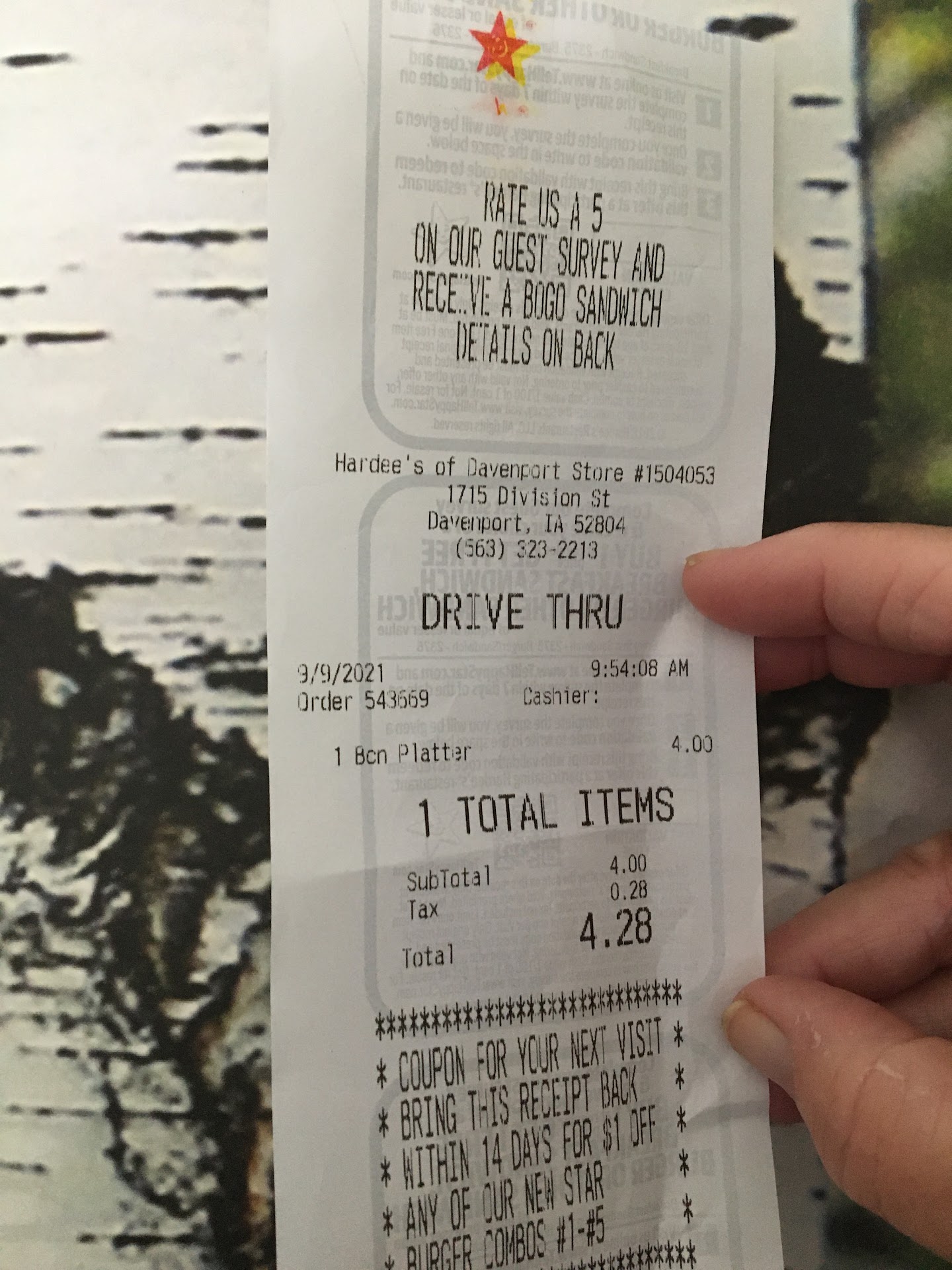 UPDATE October 7, 2021, Kaitlyn Peterson lied and sent me nothing. But another person in WI called then sent me 2 free meals via mail. I went to use one, asked for no sauce, no lettuce but got both on the sandwich. I also asked fir pickles and received none. I guess the employees they hire at Division St Hardee’s in Davenport cannot read because it’s rare for them to get order correct if it’s not breakfast.