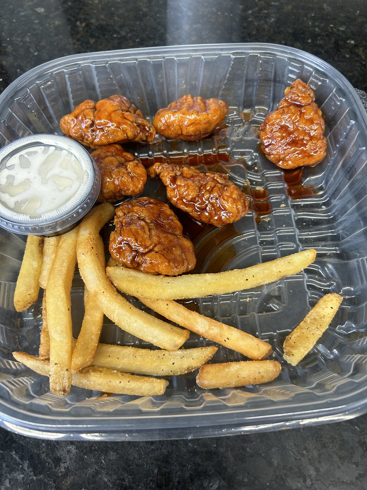 Read moreThese wings used to be the best around. Ordered tonight and so disappointed. My wings are so dried out and tough that I ate five and just can’t finish the rest. I am gonna pull out left overs from last night to eat instead. Also, used to great curly fries and ranch. Now it is horrible straight fries and white water. Not worth the price I paid. Son got glorified chicken nuggets and his are hard as a brick. Offered one to the dog and you can hear the crunch as she chewed. Very disappointed it the quality...
