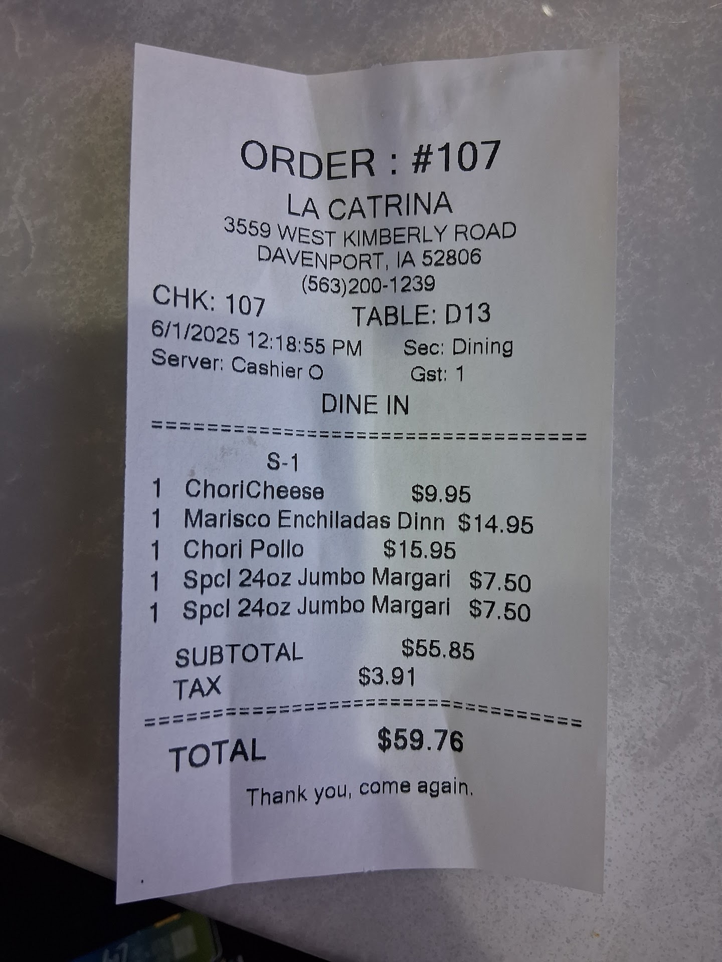 Read moreThe Food is Awesome, Hot and Fresh. Chips and Salsa Very Good. Staff very nice and Clean Place. The Art work is Cool. REAL.. Mexican FOOD. We will be coming back many times.. Thank You for coming to the West Side of Davenport. Your Place is could get 10 Stars, It...