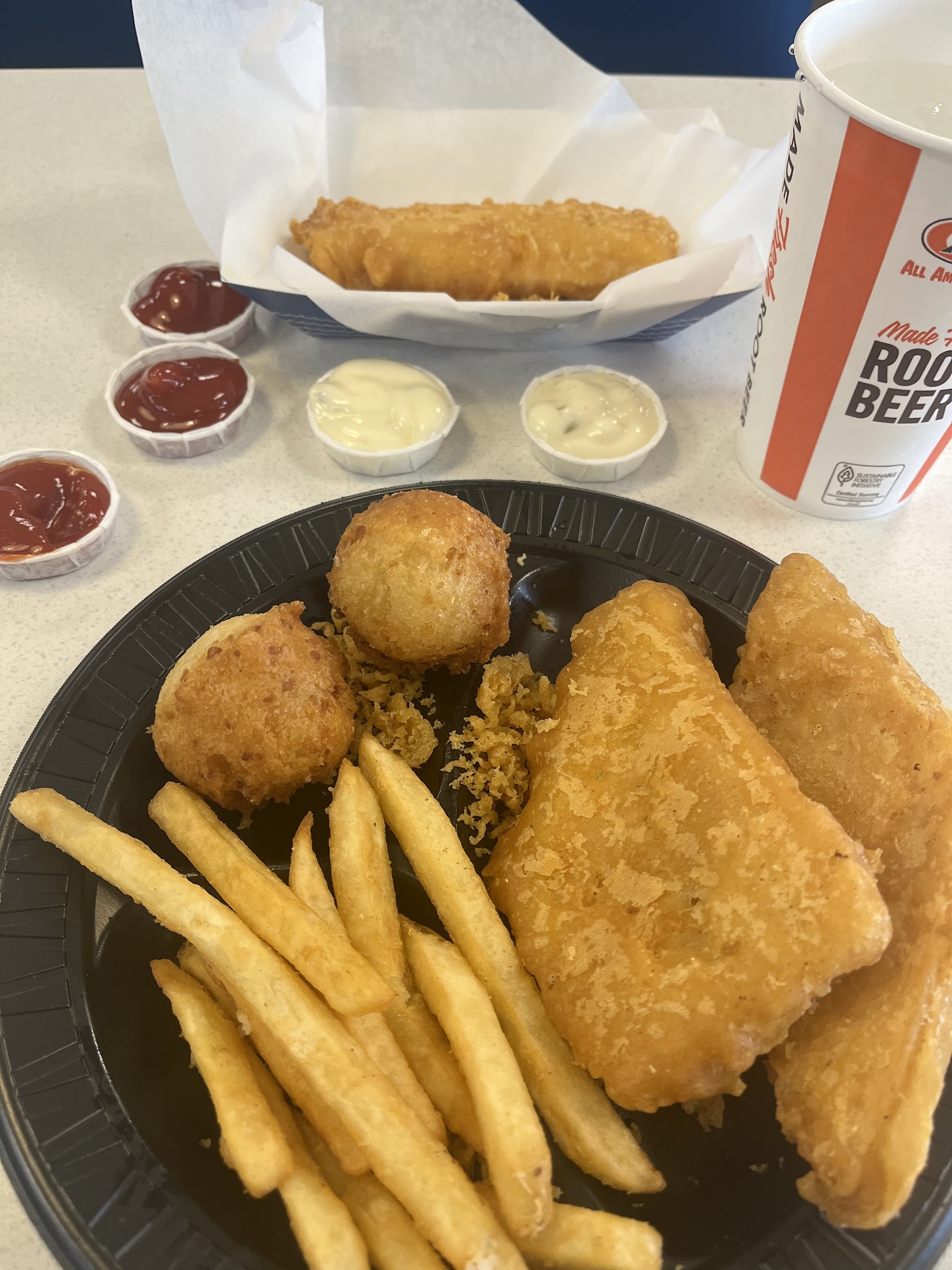 I took my wife and kids there to eat at the place. It was filthy and the service was horrible. The girl that took our order was rude and didn't listen when we ordered our food. When we got our food we were missing a kids meal. We asked her about it. She said we only ordered one of the kids meal and when she was going back up to put in the order she rudely asked me well do you want to order another one and when i was going up there to pay for it and gentleman that was already there eating got up and went up there and paid for it for us. The drinks in the fountain machine were luke warm even with ice. My wife found hair in her burger. I also did not get a drink with my meal. It was not mentioned with fish meals that a drink was not included in the meal. The food tasted stale and seemed like it was not fresh. Even our kids who love fries and chicken did not eat it because they thought it tasted off and they turned it down. My wife had to go ask for lids to fit her and our sons cups. The lady was rude about that also. The place was kind of empty also when...