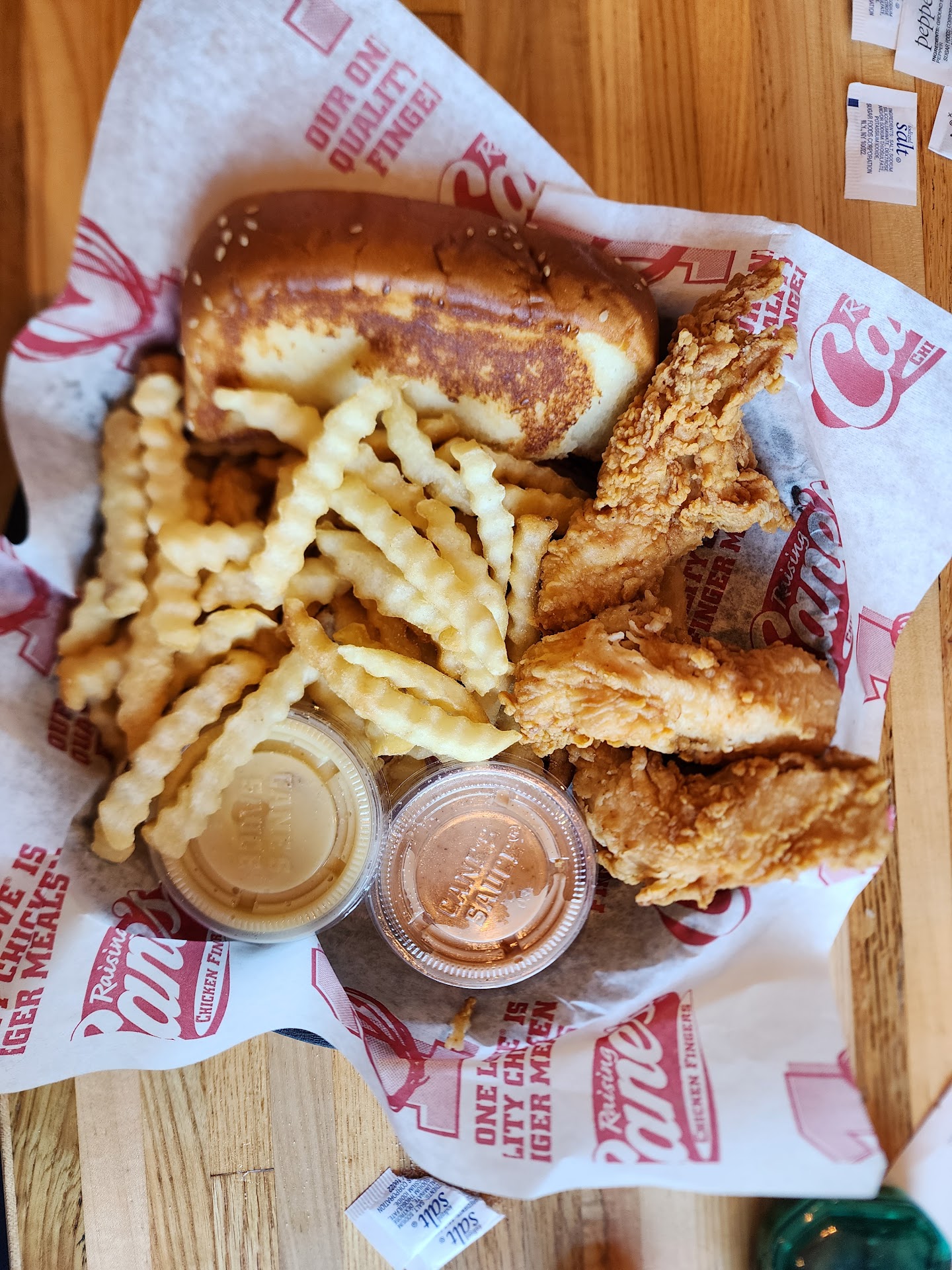 I went to Cane's for my first time today. The first thing I noticed when I entered the restaurant is that the music is WAY too loud. The menu only has four combos on it, and the only difference is the number of chicken fingers in each combo. They have a chicken "sandwich," but it is just three chicken fingers in a bun. The sauce that they claim is "The Boss" is just diluted Thousand Island dressing with too much pepper. The chicken itself is okay, but it just tastes like chicken. The "breading" adds nothing in terms of flavor or texture; it's just there. The fries taste like fries, but they are all bent and curved; not many are straight. The Texas toast is good, but I don't think it needs to be there. The coleslaw tastes like coleslaw, nothing special. In my opinion, that's the theme of this restaurant. It's nothing special; it's just chicken fingers and fries and such. It's especially this way at this location, as Chic-Fil-A, a much better restaurant, is two minutes down the road. Places like Chic-Fil-A, KFC, and even Wendy's have much better chicken than Cane's, and in my opinion, there is only one reason to go to Cane's: if it's the only chicken restaurant in town. Otherwise, the other restaurants I mentioned are way better and more...