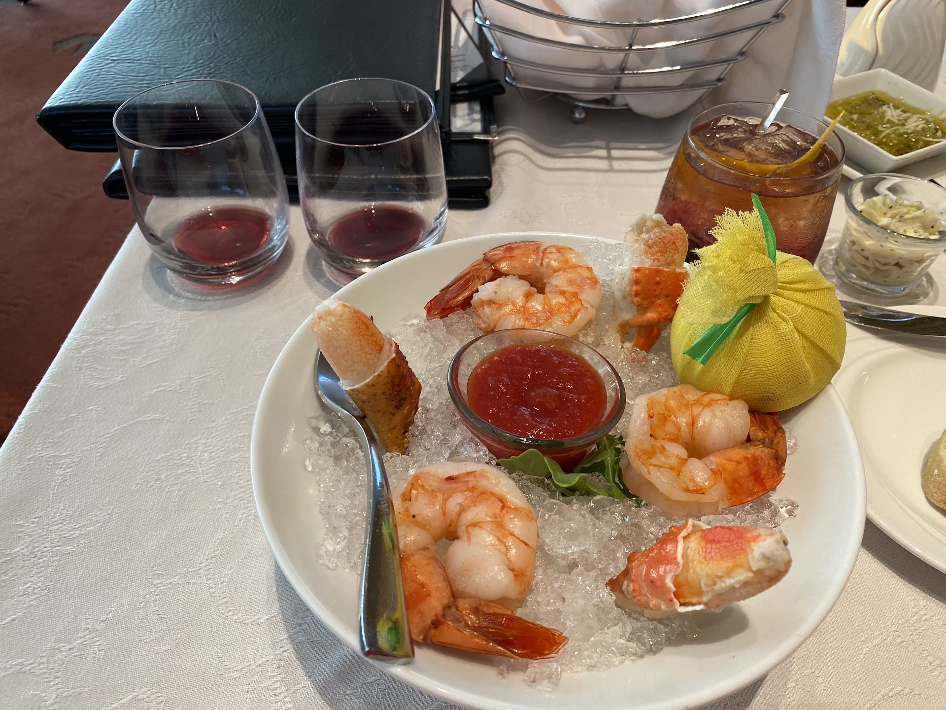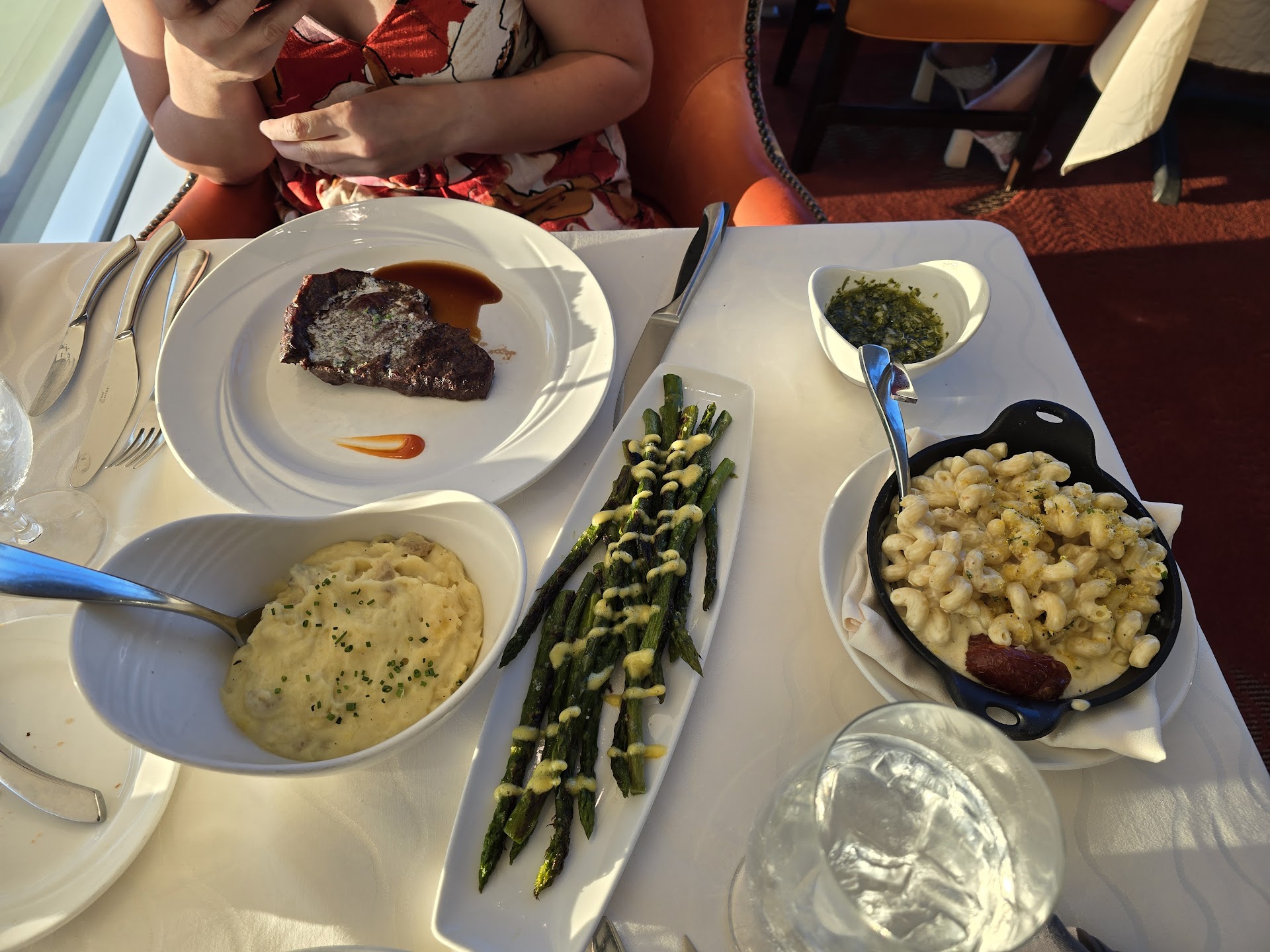 Now for the food, the bread and butter basket was absolutely delicious. We got to try the tomato basil and peaches and cream butters which were absolutely delectable. The breads were also absolutely fantastic! We also ordered a tickle me pink and a red sangria, both of which were also very average. The tickle me pink had a cough syrup flavor that I wasn’t the biggest fan of, but to each their own. The filet medallions and shrimp was one of our meals. The filet was not very tender and didn’t have much flavor, but the shrimp was very good. The potato confit it came with was also very good along with the onion strings. We also ordered a Maryland ribeye which again was on the tougher side and didn’t have too much flavor. The seafood pasta was also very average, wasn’t impressed with the flavor. We got a side order of the fingerling potatoes which were absolutely fantastic a must try if you choose to go, and the Brussels sprouts which were also okay. My biggest complaint with the food is that it was pretty close to stone cold except for the potatoes. We would have mentioned this to the server if he had stopped by the table during our meal. Pasta was hard on the outside but hot on the inside, steaks were cold, Brussels sprouts were cold which leads me to believe that the food had been sitting for some time before it made it out to the table. Very disappointing.