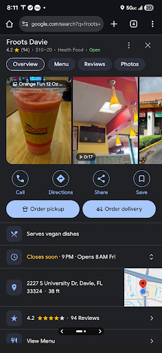 Ā Ā Ā Read moreWant to save some aggravation, well then don't even think about stopping at Froots and just keep driving. Yes, I decided to try one of these generic smoothie and wrap huts, just stopped in today for their Jerk Chicken Wrap. So, my trashcan enjoyed a wet flour tortilla mass oozing with mayo, cream cheese and the blandest water-soaked chicken as filler.