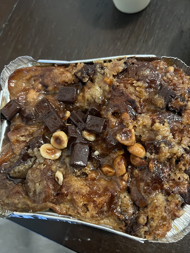 The bread pudding is the best bread pudding I have ever had, the top has some chunks of sweet high quality chocolate chunks and some peanuts to give it a nice texture, and it comes with a lightly sweet white sauce to moisten the bottom layer to make a perfect bite.