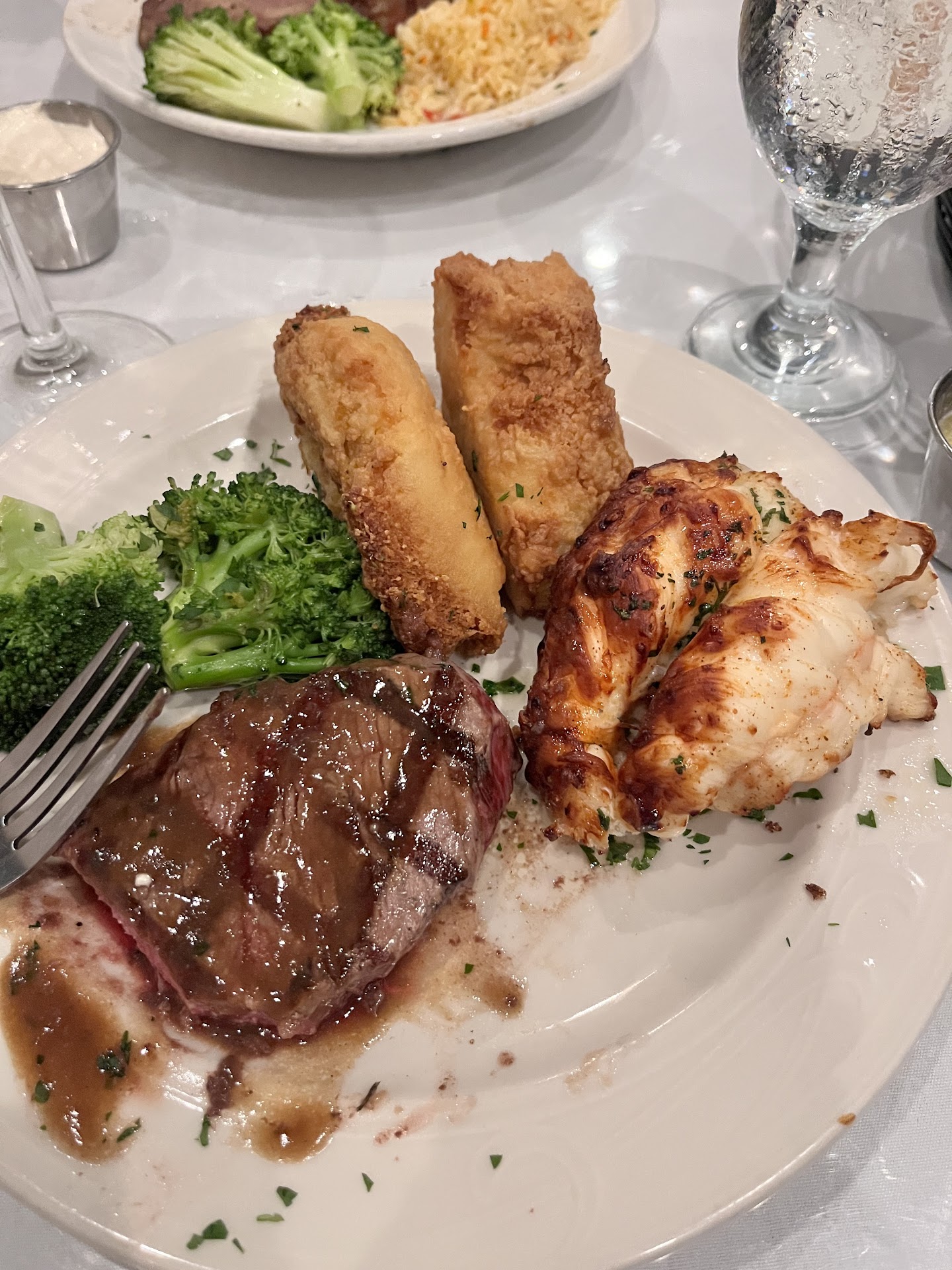 First time. Not impressed. Waiting to be seated, waitress at bar shouts over âyou have reservationsâ not very classy. Had to keep asking for silverware, bread dishes, S&P. After ordering waitress disappears. Had to go to the bar for next round of drinks. Food came out, steak great lobster tails way over cooked. Where is server to check on us ???? After meal, we told her about the lobster. She said if you told me sooner I couldâve done something about it !!!!!!!!! You were nowhere to be found. And an automatic 20% tip. Iâm sure we will give it one more try...