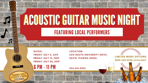 Read moreOur friends Steve and Susan saw a post on Facebook for an “ Acoustic Guitar Music Night” . Last night was our second Friday that we attended . And I am writing to tell all not to miss the last one on July 26. Judging from last night‘s crowd please get there early . Where to start? Tower deli , now Tower deli and Diner has been a Davie staple for over thirty years .As Ben the owner said, “ we have breakfast and lunch down pat! Let me tell him they have the dinner menu down pat as well. We had a fantastic Pear and Gorgonzola salad . My entree was a turkey avocado cheddar melt with coleslaw. I am an avocado lover so one can imagine how tasteful and enjoyable the melt was. Ben serves up the freshest and sweetest coleslaw in town! The night was even more magical when we were served by Teresa. I am glad to see her now working here . Teresa is a professional . She treats all customers like family. Last night she waited on all present with charm and a friendly attitude and never skipped a beat!🎼🎼🎹pun intended! ! I plan to see you all...