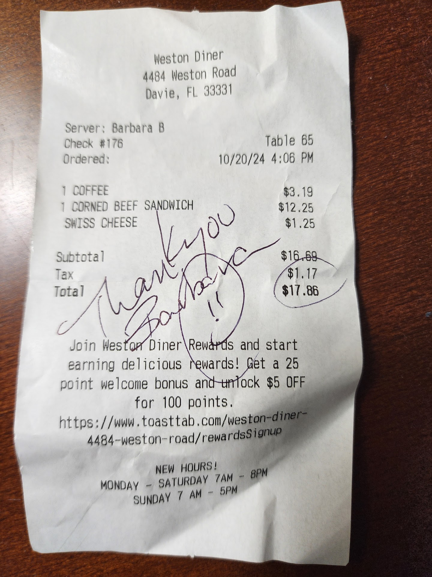 After the fiasco Weston Diners' manager caused us, we went to Bagelmania. Funny thing, another couple showed up at Bagelmania that we had seen at Weston Diner earlier, as we waited for a table while being completely ignored! We recognized the couple and said "hello". The couple in turn stated the reason they left was, "we were tired of waiting for service and overheard others around our table complaining about the service".