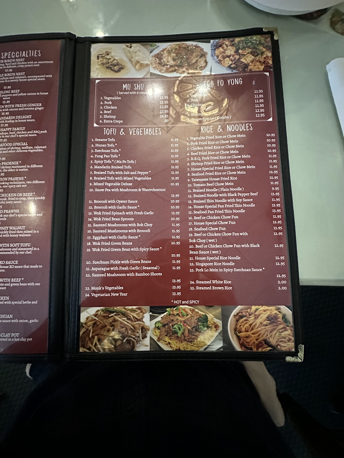 Read moreInteresting Chinese cuisine situated in a strip-mall. I guess this place has been around forever. The menu has some of your typical Chinese restaurant items, but has a "house specialty" section with some dishes I've never heard of before. They also have a good selection of vegetarian options with that funny soy-based fake meat stuff. Had such a strange texture but tasted okay. We ordered "Bird's Next Club" or something like that. It came in a edible bowl made of fried shoestring potatoes and had a bunch of vegetables, seafood and beef in it. It was quite tasty. The restaurant looked old, but that only added to the charm. The ornate Chinese chandeliers had so much dust on them it was distracting. The wait staff was helpful and friendly. I would go back...