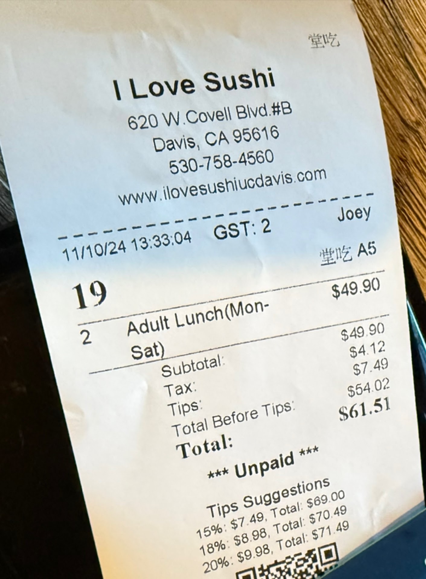 Read moreI tried "I Love Sushi" for the first time yesterday. After reading several conflicting reviews, I decided to make up my own mind. Here's my experience/perspective. It's a family-run restaurant. The servers are efficient but not overly friendly. This small restaurant was busy with three sushi chefs preparing the roles, etc. However, the food was sub-par and quite disappointing. I'll start with the good; I enjoyed the shrimp tempura, which was hot, crunchy, and delicious, and the tea, which had a lovely sachet inside the pot. Many folks were enjoying the wide variety of Sushi rolls, but I wasn't up to it, so I can't rate them. As to the rest; Almost everything was soggy: Good sushi rice sticks together & is made with rice vinegar, sugar, and a hint of mirin. This rice was bland and watery.. & everything was served with rice, even the chicken teriyaki. The cucumbers in the Temaki wraps were limp and wet, and the wraps were essentially flavorless. The Unagi wasn't fresh; It must have been prepared earlier in the day, as other commenters noted, and it was saturated with the sauce, which was extremely sweet, The seaweed salad was very oily, and the edamame was ice cold. However, it did have a sprinkling of salt which added flavor. I have been to a few sushi restaurants in the past and remember being served Unagi over delicious rice, and the eel was warm with a light brushing of sauce. Sadly, not the case here. There is so much room/opportunity for...