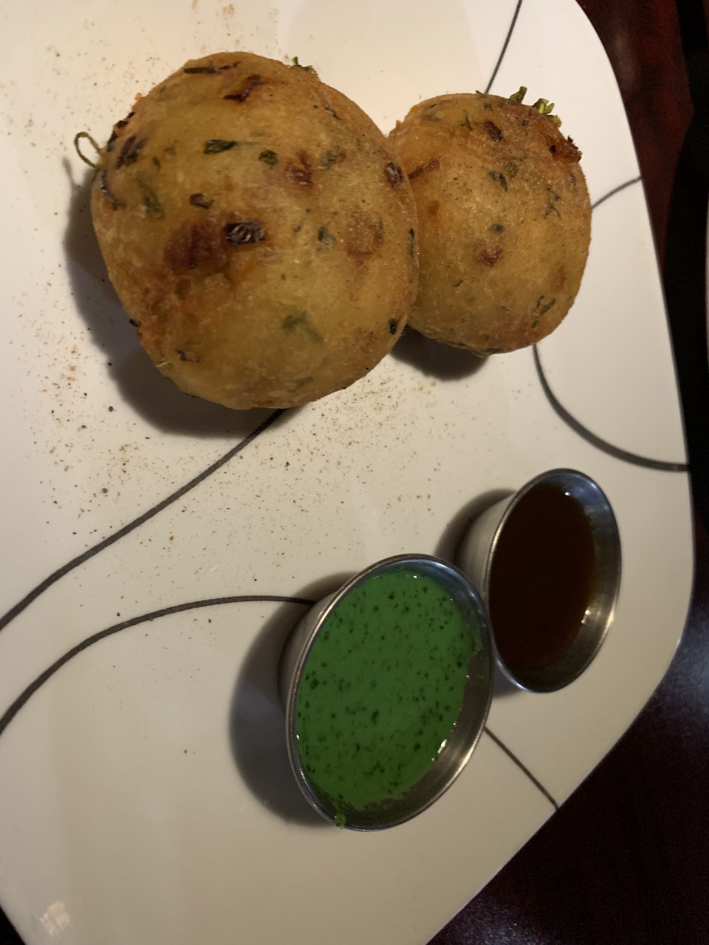 The aloo tiki were my favourite - but hey I’m irish so any excuse for a big lump of potato! They’re beautifully spiced and are served with what I think is a cilantro based sauce and a tamarind based one.