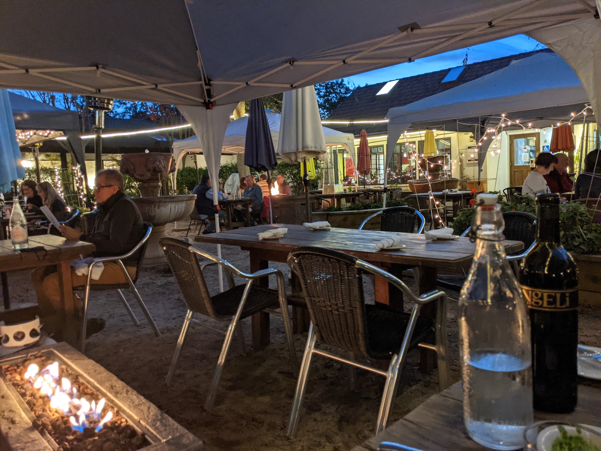 First, the atmosphere was amazing. We decided to sit outside because of the lighting, weather and propane fire. Definitely a romantic setting! We sat near the back which was perfect.