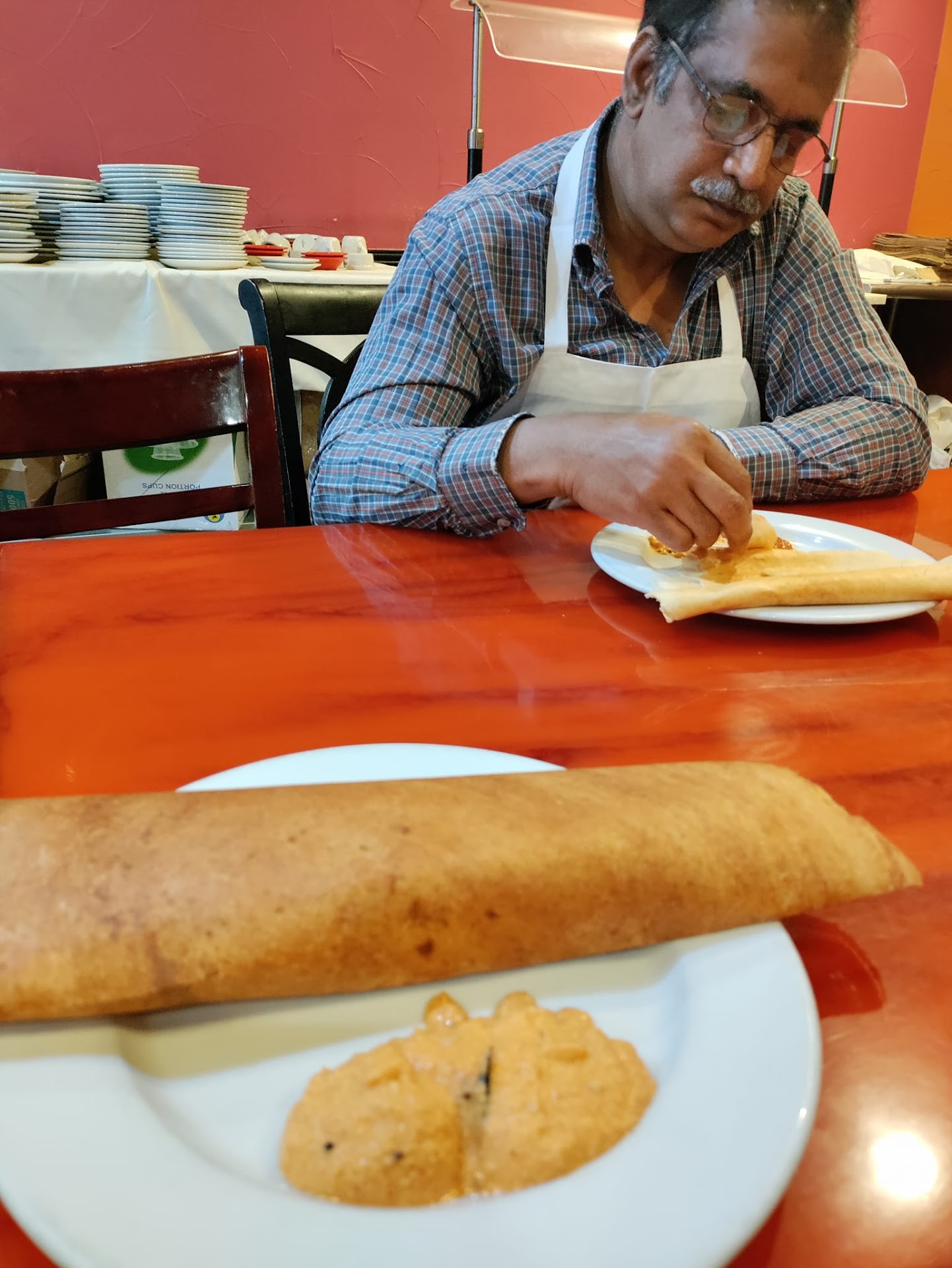 We went here with a party of 4 and ordered Rava Dosa, tandoori sizzler, Idli/Masala Dosa and vada plate and 2 rasam.
