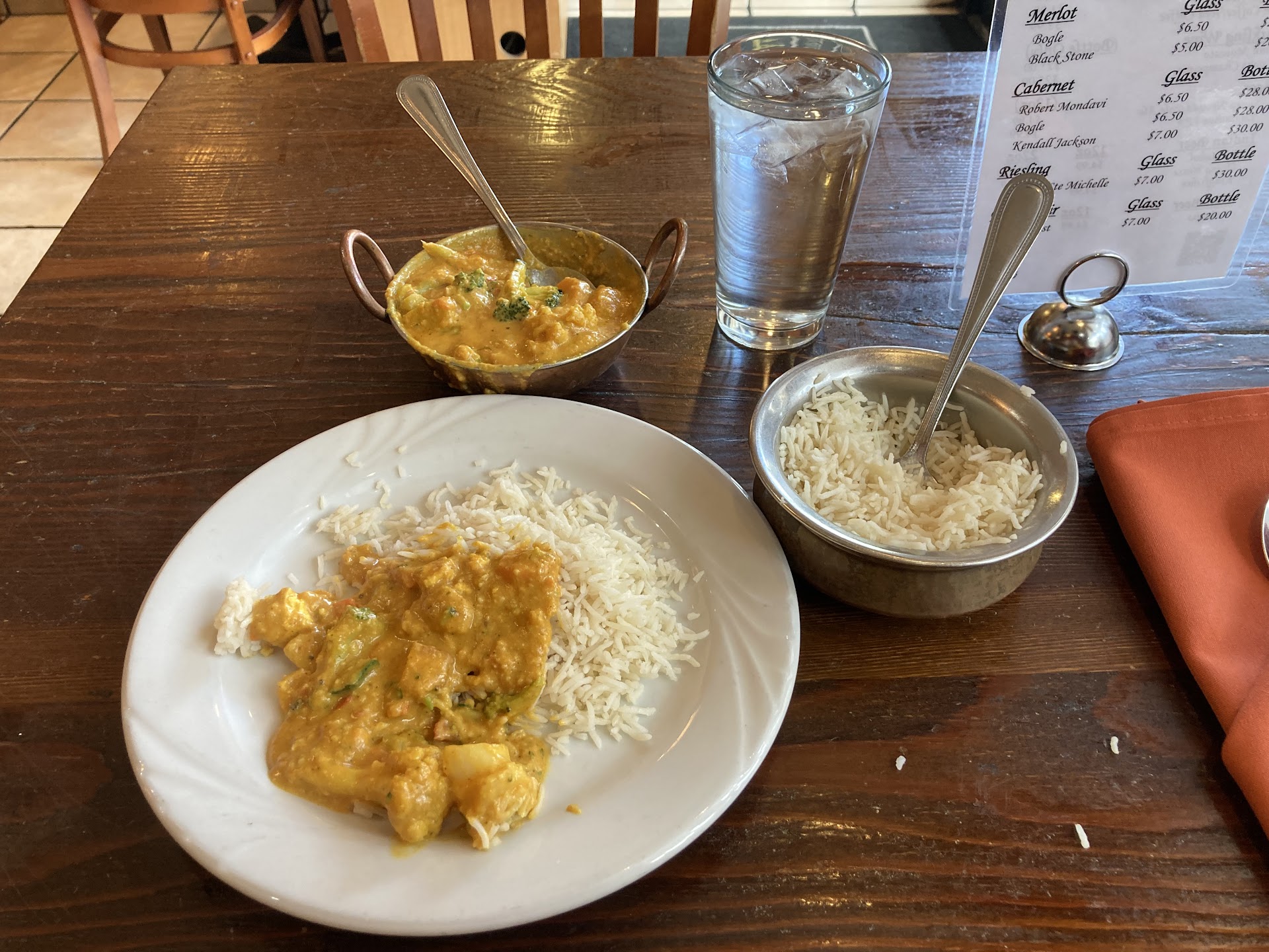 Just got back from the worst dining experience of my life. We ordered wine, an appetizer, entrees and dessert up front. The drinks and apps come in about 25 minutes...but we never got our entrees. After 1:15 of patiently waiting they come over and give us the bill. I had to tell them that we hadn't had all of our food yet, only the appetizers. After asking repeatedly what we ordered (even though it was on the check) we were left in suspense if our food would ever arrive. 20 minutes later I had to flag down the owner to ask for our food to-go because I didn't want to be there anymore and I was assured it would be out quickly. Another 20 minutes elapsed and we got the food and went home. Unfortunately on top of that the curries and daal were fairly tasteless and as others have said the tomato flavor tasted canned. I used to love this place. I'd bring my mom when she visited and friends from out of town. Even ordering catering for the holi celebrations. It really hurts me to write this review, but I don't know if I...