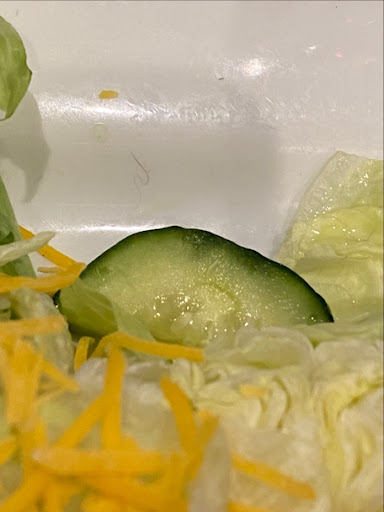 Then the salad was brought to me. First I noticed a big chip on the plate, which can harbor bacteria. Then I look on another area of the plate and there is dust and hair. Then when I got my replacement salad, the salad was already browning.