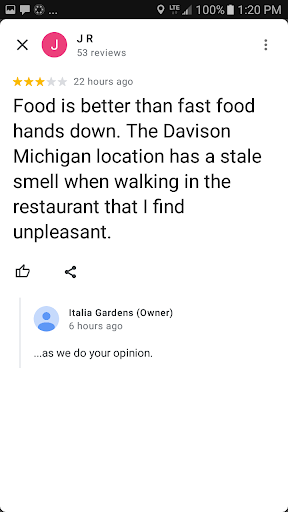 Read moreCHECK UPDATE LOWER ON THE PAGE. Get a new manager. This place usually has good food good service the Tuesday and Wednesday specials make it very affordable. They also give complementary salad and fresh bread. It is a great place to get good Italian food. This was a 4 star review UPDATE 03/03/2019 My family and I five in all went to Italia Gardens in Davison 3/03/19 we all ordered spaghetti. The bread and salad was good, then the spaghetti showed up. First the waitress didn't have a cheese grinder ( they were all broke ) But all of our spaghetti's were cold room temperature. I tell the waitress she was very apologetic took all the plates and brought mine back less than 5 minutes and goes to get the other plates. My spaghetti was still cold in the center she grab mine and took it back again, nobodys plates were hot just warm, i went up front to ask for the manager. She was waiting on take out customers and answering the phone, she ask me if I was there for take out, I said No. She scurried away, I waited finally I told the hostess to send the manager to my table please. After waiting ten minutes no manager I went up front again and the manager is on the phones that are busy but I wait again she finally decided to talk to me, I told her the problem she claims spaghetti and sauce are set at a certain temp but they could heat it up for me, I told her it went back twice and was still not hot so I was done, she said she had not talk to the waitress yet but would remove the meals we didn't want. I may have said something to piss the manager off but if I can't get a meal I will have a show. But this manager didn't have enough courage to come by the table and apologize for the problem. The waitress apologized so I paid the $32. bill and we left a $7 tip, all the waitress can do is bring out what the cooks give her. I will not nor will I ever recommend Italia Gardens in Davison The food and MANAGER SUCK. I have never had a problem with Italia Gardens in Flint on Miller rd. and will drive the extra miles to eat...
