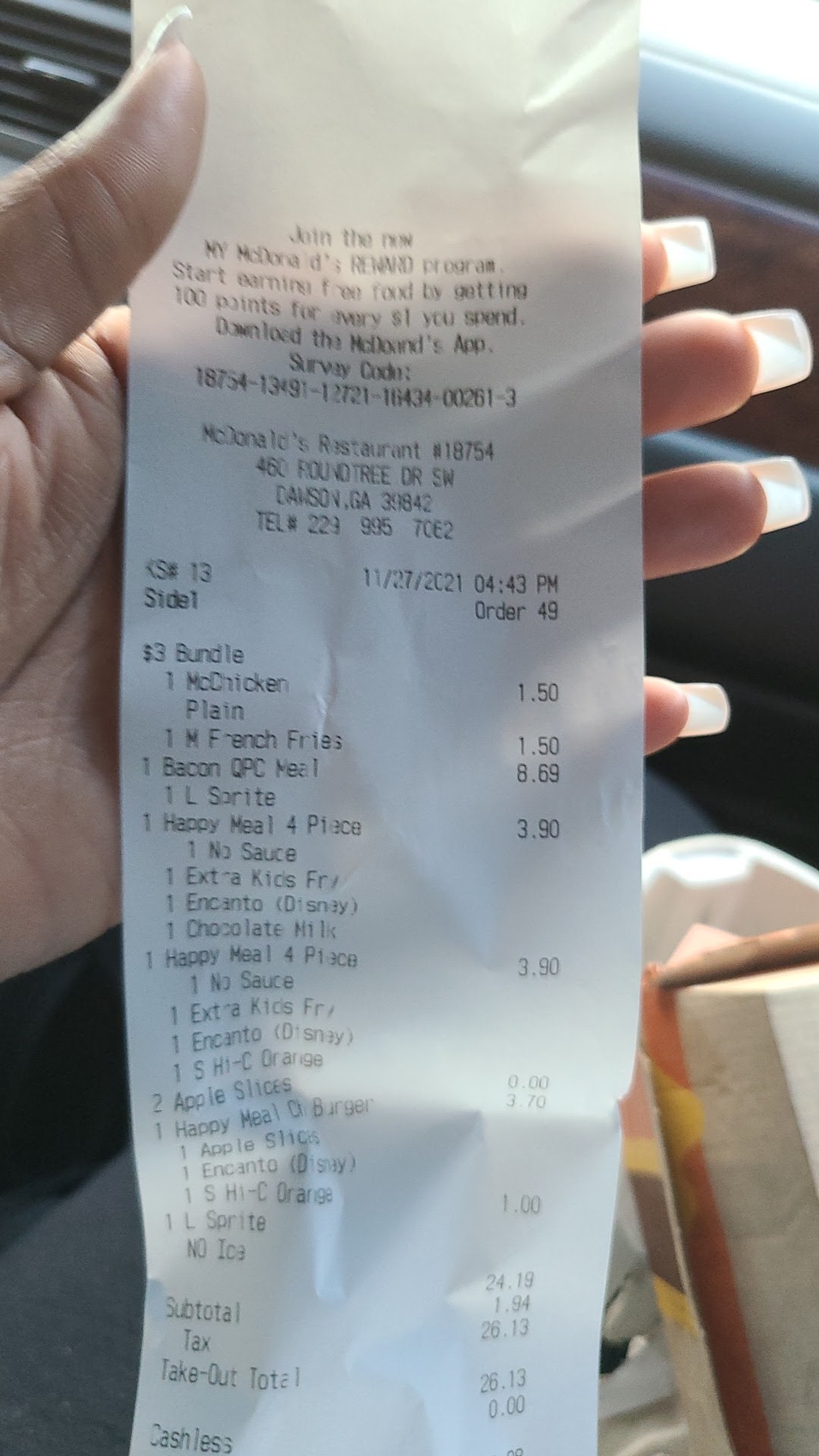 Read moreThis location was terrible. Urinal didn't flush. No soap. The food took longer than it should have to come out. Our cheeseburgers came out cold - the cheese wasn't even melted. They forgot my wife's salad. I spoke to a person who appeared to be a manager or shift lead and gave her the receipt. She'd ordered extra tomato. The person I spoke to seemed annoyed and when we got the salad it was pathetic. Just a few pieces of lettuce and the tomatoes. It didn't even fill the container halfway. The unsweet tea tasted like the urn hadn't been washed in days. Although that happens a lot in restaurants, it's still disgusting. And the Diet Dr. Pepper tasted very strange. Several employees were sitting in the dining room on their phones. They might have been on break, but we don't know that. It's against policy at any restaurant and just shows the lack of attention at this store. Then, worst of all, they told our girls they didn't have the toys they wanted, but their cousin got that toy. That's exactly what we need with three and a half hours...