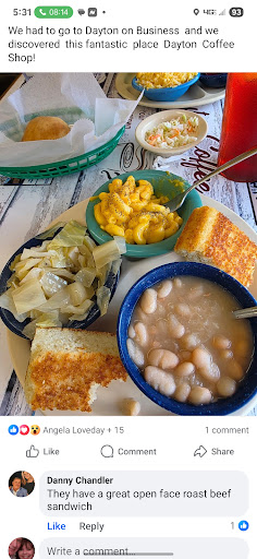 My husband and I visited Dayton Coffee Shop this morning for the first time. We were just out driving around, and started looking for a place for lunch we had never been. Anything called a coffee shop, I would normally shy away from; but I'm glad I looked at their menu first. We gave it a try, and were blown away. It's small-town diner at it's best. The meat and three selections were great. Don't get the tomato casserole - you'll thank me. But you can get double of everything else, and will not be disappointed. We went on a friday, so I got the baked ham. I ate it so fast, my husband didn't even get to try it. (Whoops! ) He ordered the chicken fried steak with gravy, and was raving over how good it was. We also got corn nuggets, pinto beans, and mashed potatoes, plus a tossed salad. The bread selection was perfect today. We tried the cornbread, rolls, and hushpuppies (available on Fridays) since we had never been there. All were delicious. We noticed that every table around us (mostly older, retired folks) ordered desserts, so we had to as well. We ordered the chocolate pie and the chocolate cake with cream cheese icing. The pie tasted EXACTLY like I wanted it to. The classic pudding texture with meringue on top was straight out of my childhood. The cake was pretty good, too! I believe all the desserts were homemade. The employees were great. At one point, they all stopped what they were doing to help an elderly couple out of their car and into the restaurant , then back out when the time came. You can tell they pride themselves on community there. The menus and walls are covered with dedications to service men and women. If those walls could talk! I highly recommend visiting if you've never been. We will make the drive from...