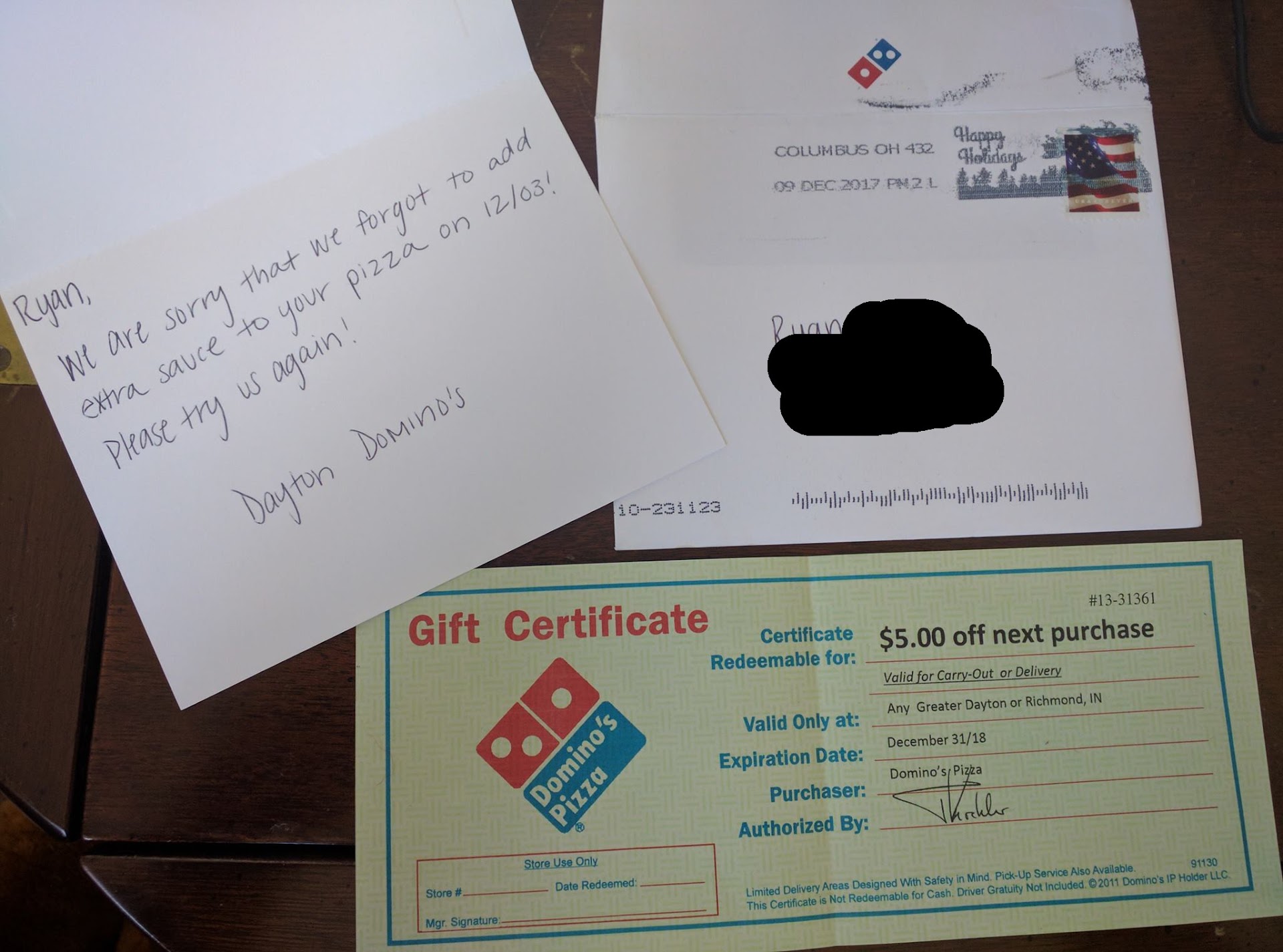 Most recently, we ordered a pizza with extra sauce and they forgot the extra sauce. So they gave us a credit for a free large specialty pizza. They apologized and made it right....
