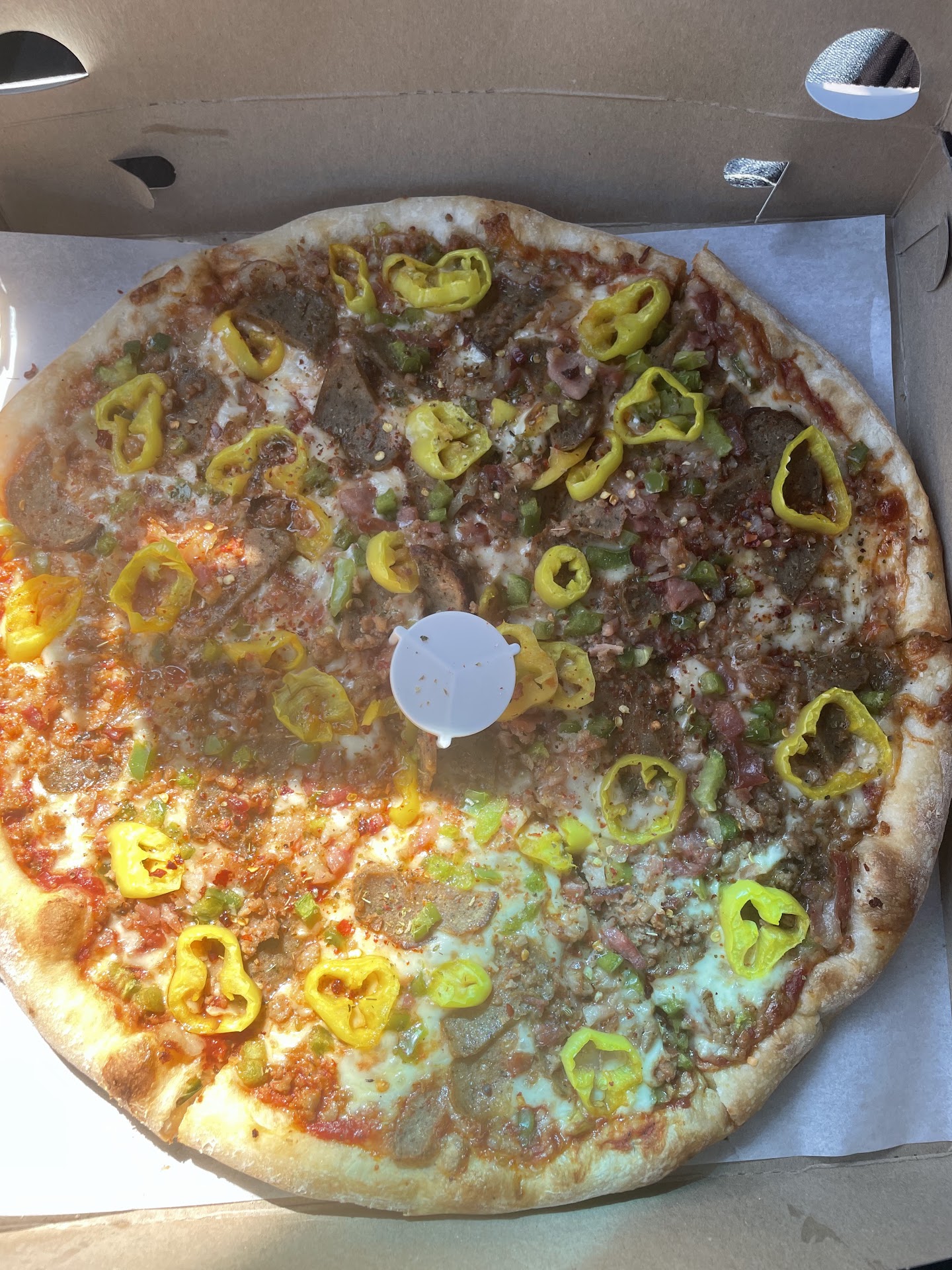 We ordered a large with pepperoni on the entire thing, and black olives only on half. The toppings seemed severely undercooked. It was as though they had accidentally made it a cheese pizza, realized their mistake, and then put the toppings on two minutes before the pizza was done. The crust and the cheese were somehow cooked enough, but not the toppings. I don't even understand how that works.