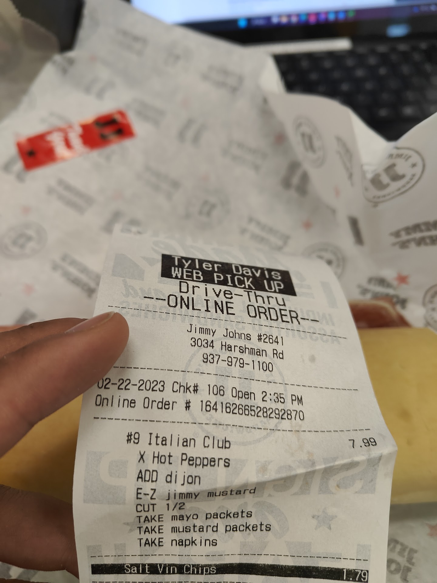 The photos included were from today. Sandwich not cut in half, I didn't get napkins or mayo & mustard packets as requested. I requested an extra side of hot peppers at the drive-thru window because I had a feeling they wouldn't actually put extra hot peppers on the sandwich...