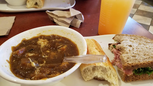 This has to be the worst Panera in United States. Slow is an understatement. Chaotic. Dirty. Food not prepared correctly and soup cold plus the prep, presentation was sloppy. No tables cleaned even though sufficient employees at the time. Restrooms were not stocked, clean. To go and delivery orders take PRIORITY. This place was not that busy for the absolute hell it was. Walking in, plenty of seating and 3 employees taking orders(like Wal-Mart, more unused cash registers closed, why waste the space!). One(1) woman in line ahead of us who had issues, as we went to another line up, 2 employees walked away. Get behind the impossible one again. Several people entered, female employee comes out front, takes their order instead of asking if she could help(she saw us?!). We finally ordered in her line after 6 others and 20 minutes. The original lady when we entered was still in another line🙄 If you're still reading, thank you for heeding the warning. I understand a bad day but... Beeper in hand with our drink cups, we search for a table that's been cleaned. Arriving at the front of the place, we have circled for a whole tour of each section. The narrow corridor ro get your food is narrowed even further by the to go stand of which nothing was ever placed there. Worst location ever. The wall is lined with people waiting for to go orders as people enter/exit from rear door. And that's the location for drink station plus trash, dirty dishes at the door? 3 employees to prepare food must have all been training. We received food after 20 minutes. COLD soup, cheese wouldn't melt on French Onion. Sandwich fell apart. Baguette was rubbery. Drink station sticky. 45 minutes before we sit to eat with worst service and food=we will never go to this location again! Must be a...