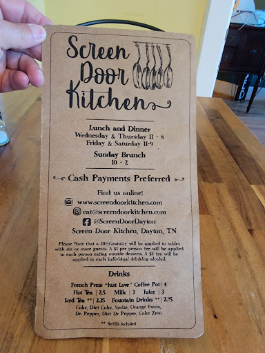 Read moreThis place has been on our âmust try listâ for quite a while now. We have 5 kids so âdate nightsâ are far and few in between. So when my Uncle and his son came in to town from Maryland for a visit the suggestion of âThe Screen Doorâ was brought up and decided upon with excitement. We decided to go on a Wednesday evening, a few days before they headed back home. 7pm was the agreed meeting time since I work until 5:30 pm during the week and closing time was listed on their website and front door as 9pm. We met in the parking lot, 5 of us, smiling hugging and laughingâŚready for a pleasant last dinner together. We entered the Screen Door Restaurant to be greeted byâŚno one. We stood there for a few moments before a lady popped out from another room. I smiled and said hi, she didnât even look at me. She headed to the menu stack and just asked âhow many?â In an exasperated tone. Still smiling I said there were five of us. She grabbed the menus and and told us to follow, we didâŚa little put off. On the way to the table she felt the need to mention that their new holiday hours were only until 8pm, it was 7:20 by this time. The awkwardness was very much felt by all. If it had just been my husband and myself we probably would have just left then, but my uncles and cousin had driven an hour from Chattanooga to meet us so we stayed. Let me mention here, again, that after checking the website again, it still says open until 9pmâŚnot 8pm. As does the main entrance sign on the door. There were other people eating as well in the same dining room we were sat in so that made things a little more comfortable.