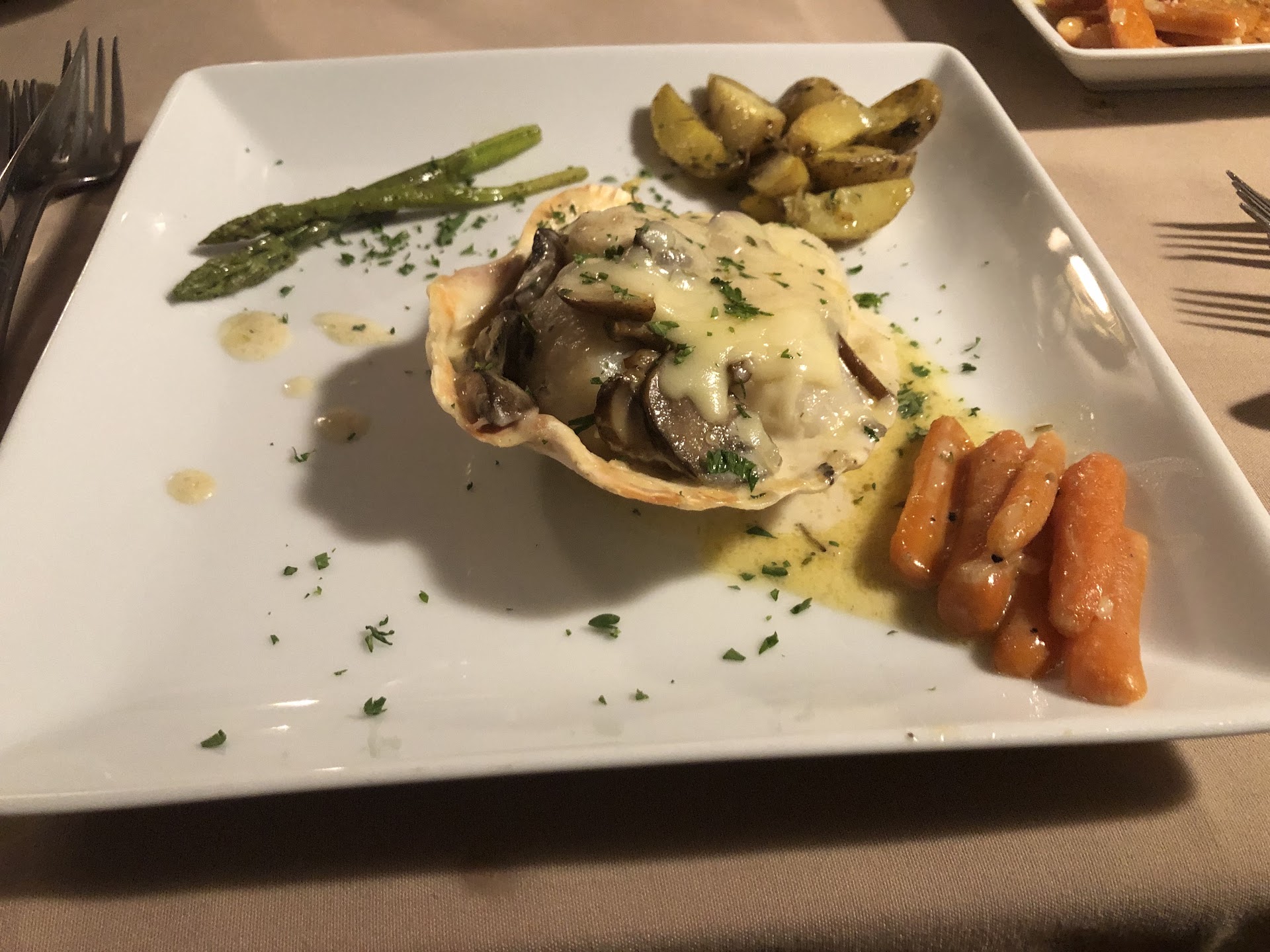 I chose the Coquilles St. Jacque (scallops) entree. It was adorned with baby potatoes and carrots and an âout-of-this-worldâ white sauce. The presentation was awesome and there was plenty to savor and satisfy my palate.