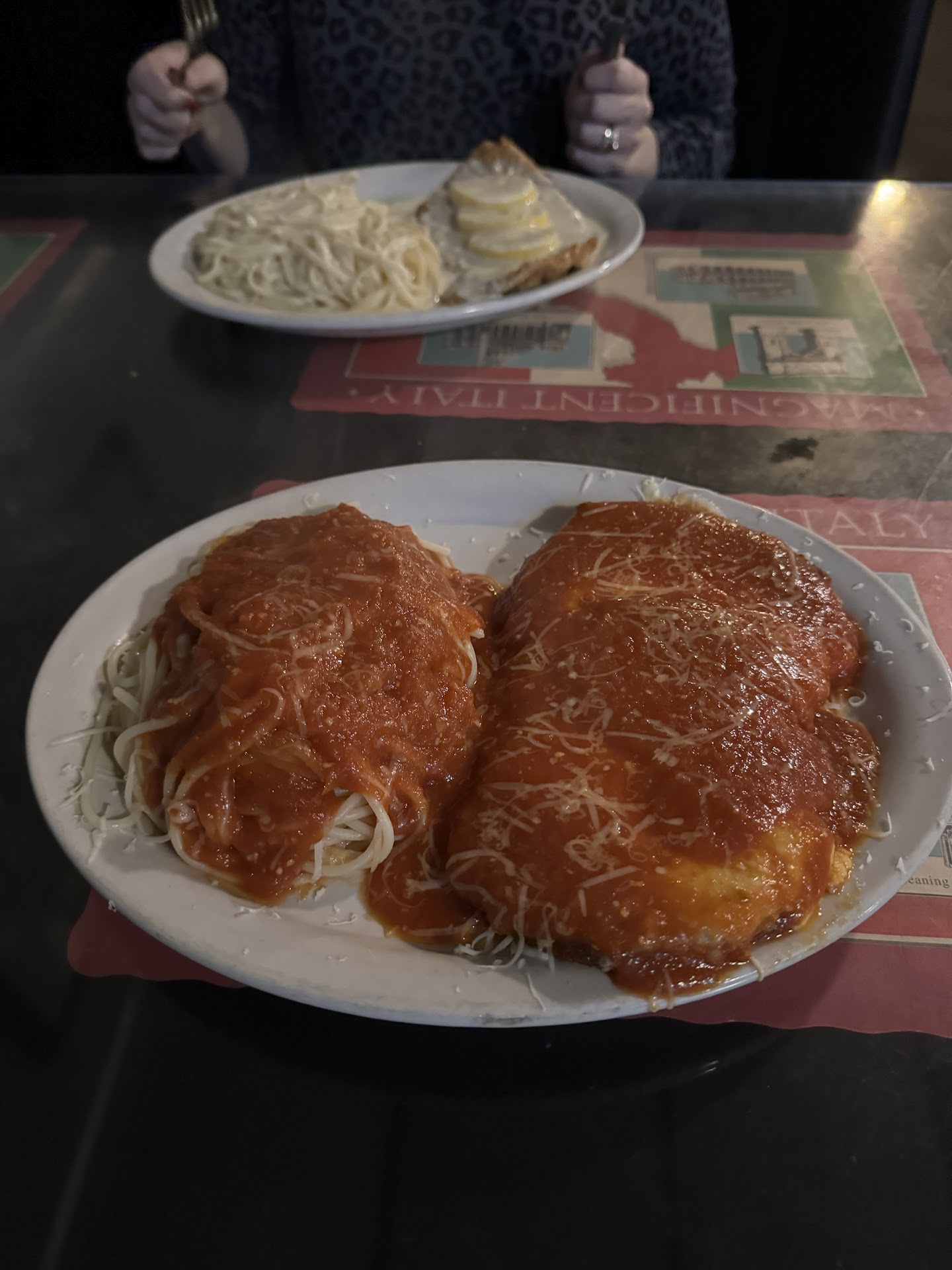 Overall experience wasn’t bad but nothing stood out and not necessarily a place I would run back to. For food I had the chicken parm which was recommended as the most popular dish and substituted the marinara for vodka sauce. The dish was also covered in a good amount of cheese which was definitely the highlight of the dish. My lovely girlfriend had the eggplant parm which I honestly enjoyed more than the chicken (if you added the vodka sauce lol) and I was debating on including this or not but was a bit put off by the server when we also asked to order a smaller pizza to share. I don’t think what we ordered was an unreasonable amount especially given we were going to take some of the pizza home for leftovers but as someone who has struggled with disordered eating and going out to eat can often be stressful, so multiple comments such as “wow you guys are so hungry” , “dang he’s still eating the pizza” and telling stories about other customers who have come in and finished large amounts of food just rubbed me the wrong way. I must add that I don’t think it was meant with an ill intent and you can tell they know/care about their visitors but nonetheless still an honest feeling to note. The pizza itself was alright, but similar to the food just lacked any unique flavor. I enjoy more doughy pizza and this had a lot more crunch so my girlfriend enjoyed it more than I did. We skipped out on desert (probably out of fear of hearing another hunger joke) but the cannoli looked good. Bill was $85 for us two and would say that it’s a decent place to take your kids for pizza but if looking for a nice date night or more fancy Italian I’d...