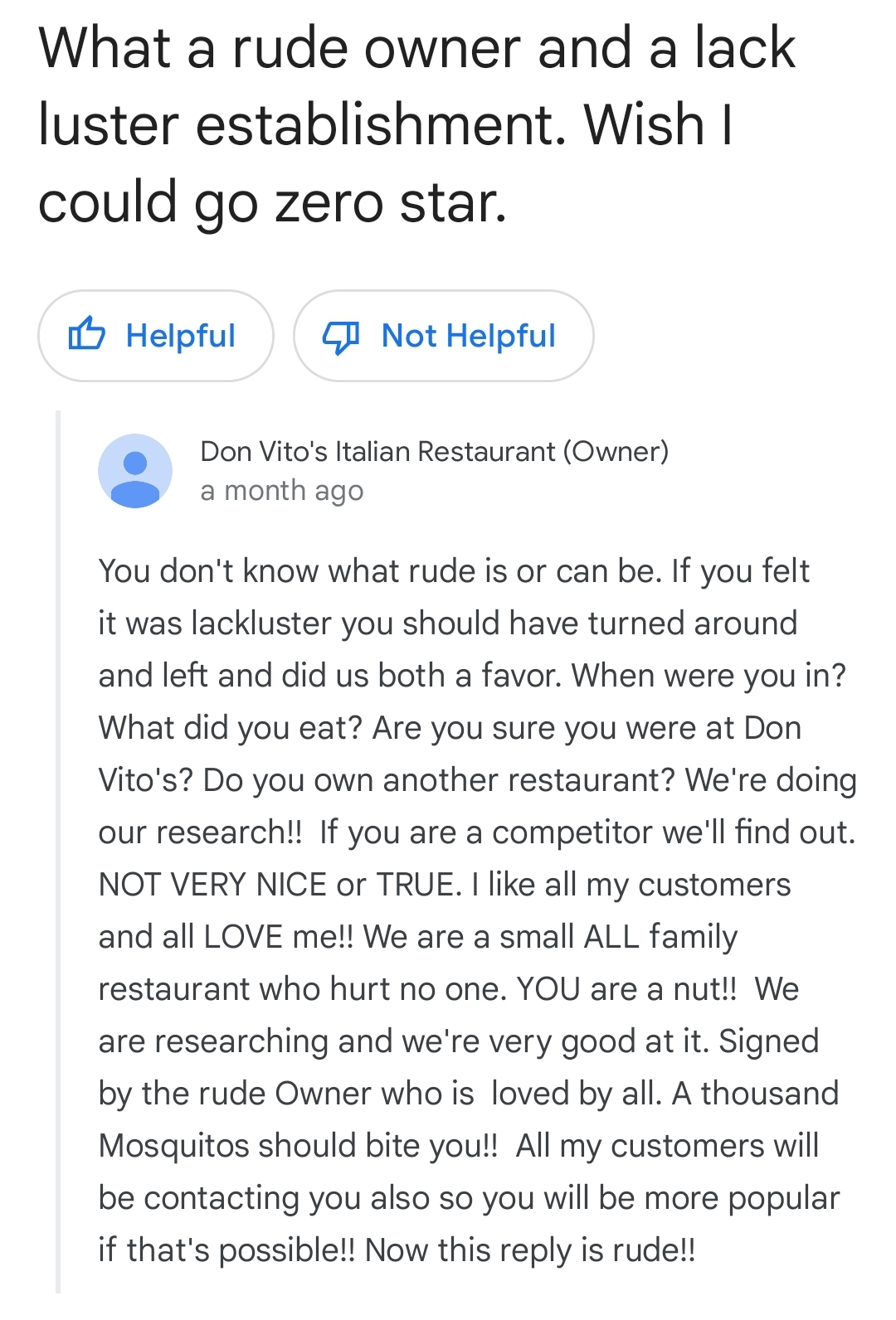 Read moreWe picked Don Vito's based on TripAdvisor reviews and couldn't have been more delighted. The owner greeted us at the door and directed us to take our pick for the best seat in the house. It wasn't long before he brought us a basket of piping hot bread for us to enjoy. Everyone was friendly and it turned out that our waitress was his daughter-in-law. She was very attentive, keeping us well supplied with water and coffee, and checking in several times to make sure we were enjoying dinner. You sure won't get that type of service at the typical restaurant chains. The house salad was a simple blend of romaine lettuce with diced tomatoes and cucumber mixed in which was pretty bland. But then again it was only a dollar. They had just run out of clam chowder, so if we had been just a little earlier I wouldn't have opted for the salad and this might have been a 5 star review. And the rest of our meal made up for that disappointing start. The golden brown calzone, which was huge and chock full of sausage and mushrooms, was oozing cheese and served with a side of sauce. The shrimp and calimari with penne pasta was a generous portion on a platter overflowing with large gulf shrimp and calimari in every bite. All in all a tasty home made meal featuring fresh ingredients. The restaurant was visually appealing and offered a very cozy family atmosphere. My one complaint was the edges of the sheets of glass protecting the table cloth had not been sanded and the sharp edge dug into my arms. But it did promote good manners, prompting me to sit up straight and keep my elbows off the table. Personally, I appreciated the well behaved, albeit doted on grandchildren, and thought it was refreshing to have multiple generations under one roof. It has been a long time since I felt more appreciated by an establishment. The prices were very reasonable and the huge portions made it an even better value. We will be back in the future for another home made...