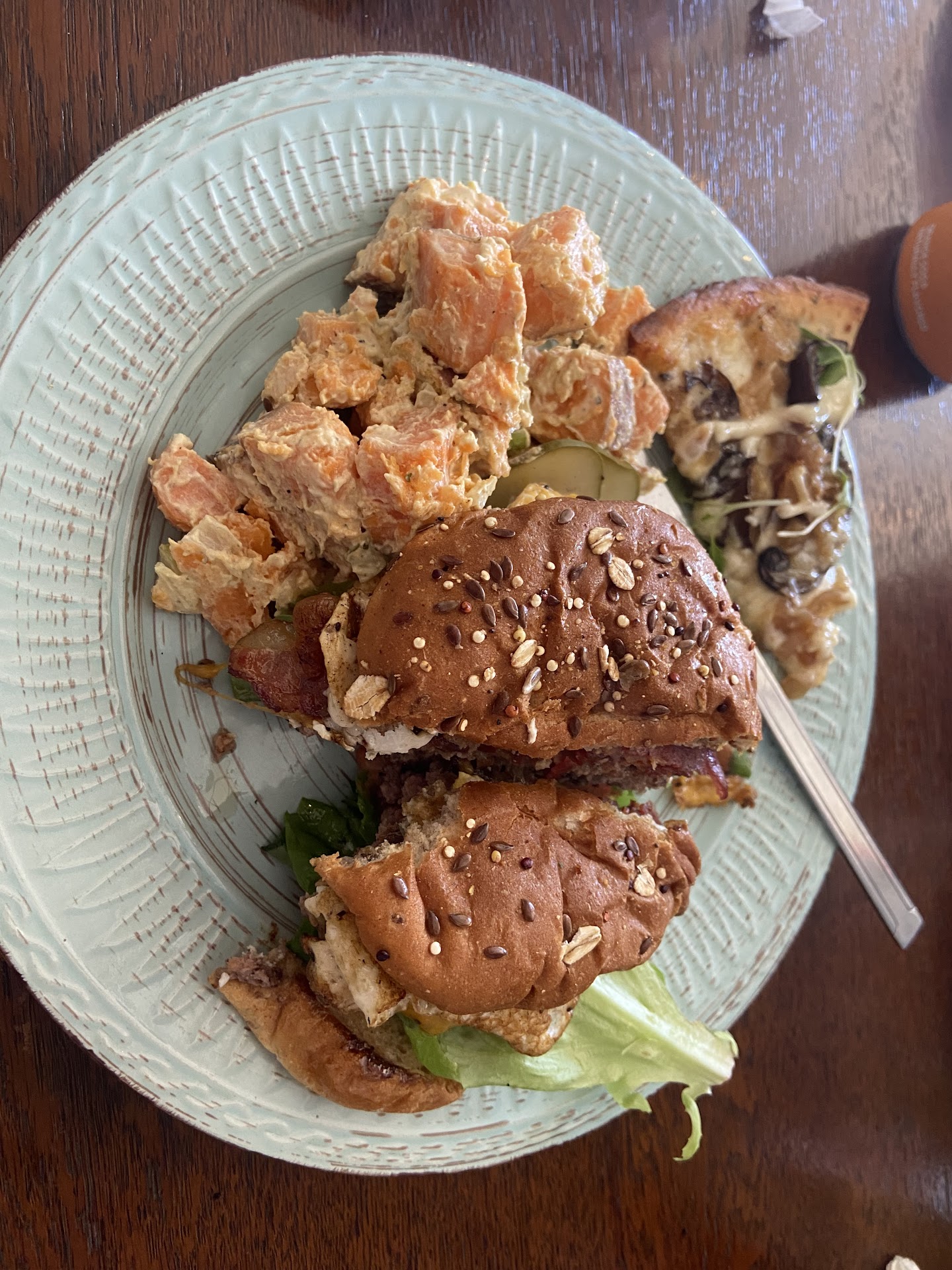 The food as you can imagine was A1!! I ordered the Barnhouse Burger and my friend ordered the Monster Mushroom Pizza with the sides of Sweet Potato Salad. 👌🏾 CHEFS KISS!! Portion was solid, the pizza was crunchy(NY’er here lol), and the burger was stacked to perfection.