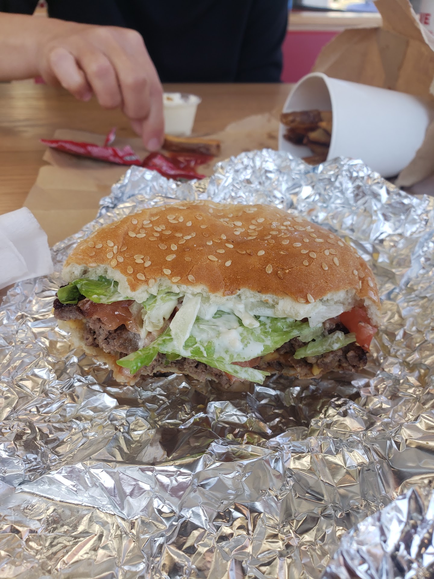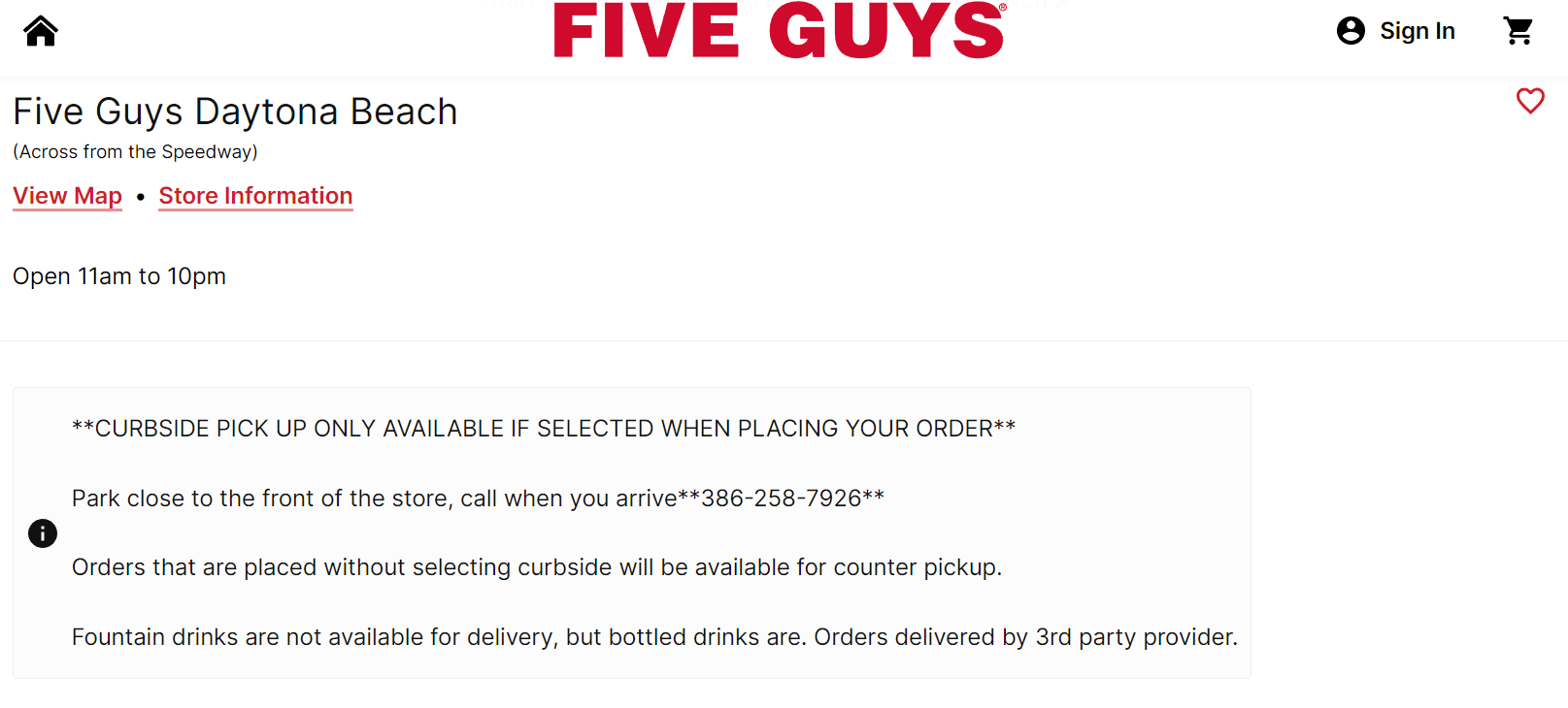 Oddly 2 hrs after eating there I got very sick.. Vomiting and diarrhea... I felt like hell for the remainder of the night...the physical symptoms lasted approximately 4 to 5 hrs then I a just weak...no fever etc so you tell me! Afterwards it was like nothing ever happened! 0h I won't eat at that 5 guy again! 2 stars for the kind fast service. Wondered why the place was so empty when Chick-fil-A had cars wrapped around the building and a line out the door...FYI I LOVE 5 Guys and have gone to two other locations without any problems after eating the food! While I do absolutely believe I had a touch of food poisoning at this location simply based on the symptoms and that I'm a nurse..