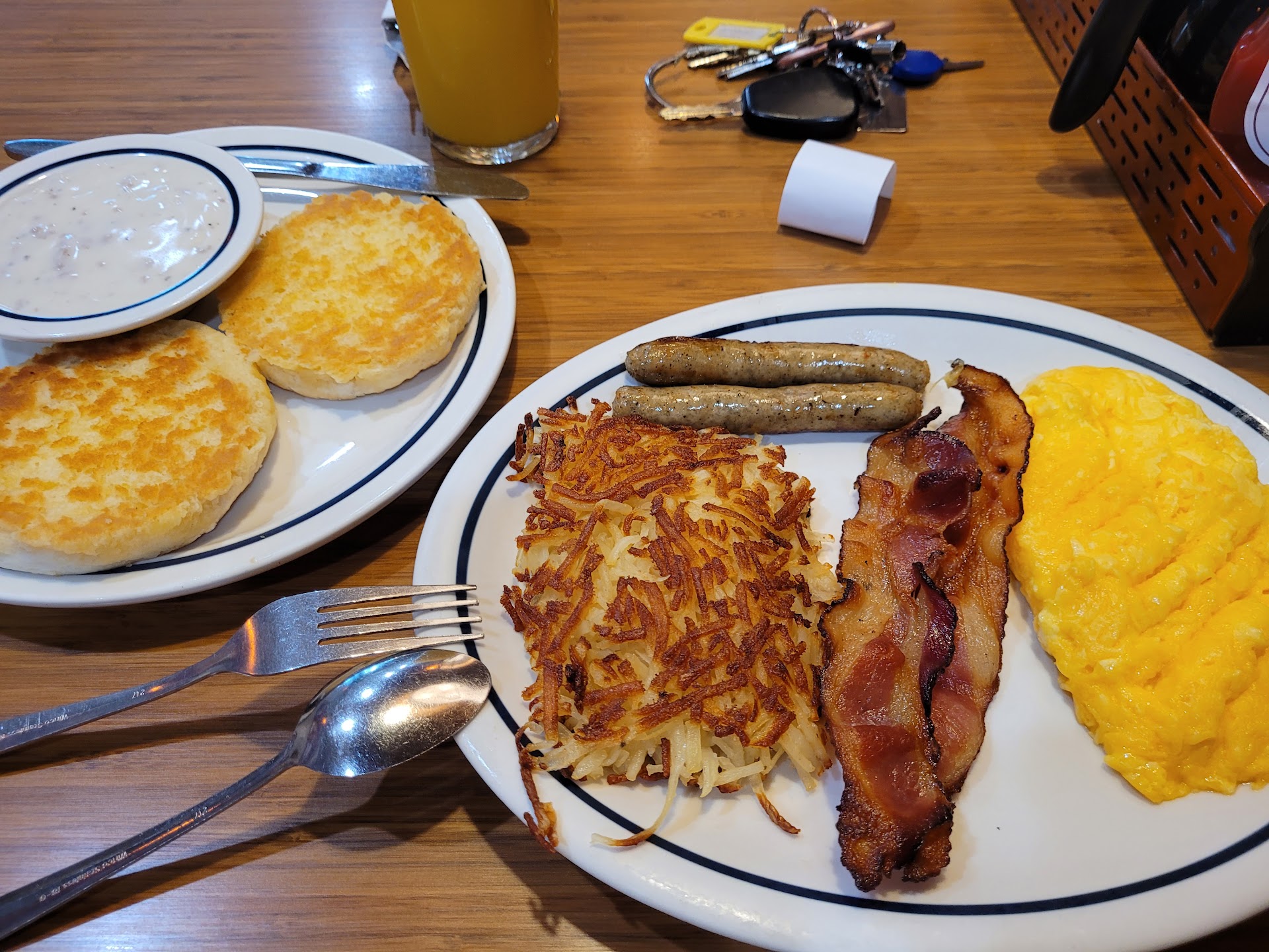 My husband had sausage gravy and a biscuit that came with a side of fried egg and breakfast sausage links. When it arrived, the sausage links has been placed on the biscuit with the sausage gravy over the top of them; we expected a side to be served "on the side" and we're disappointed.