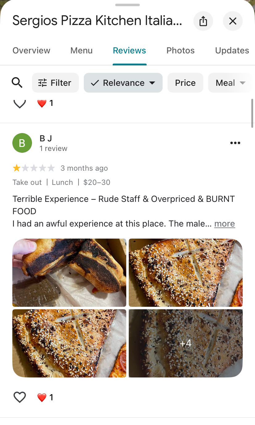 I have been purchasing food from Sergios for about 2 months now every week for work, large orders and I ate inside had a veal and meatball sandwich ordered different types of pizzas for lunch for our customers. About 20 people asked where I got this delicious pizza!!