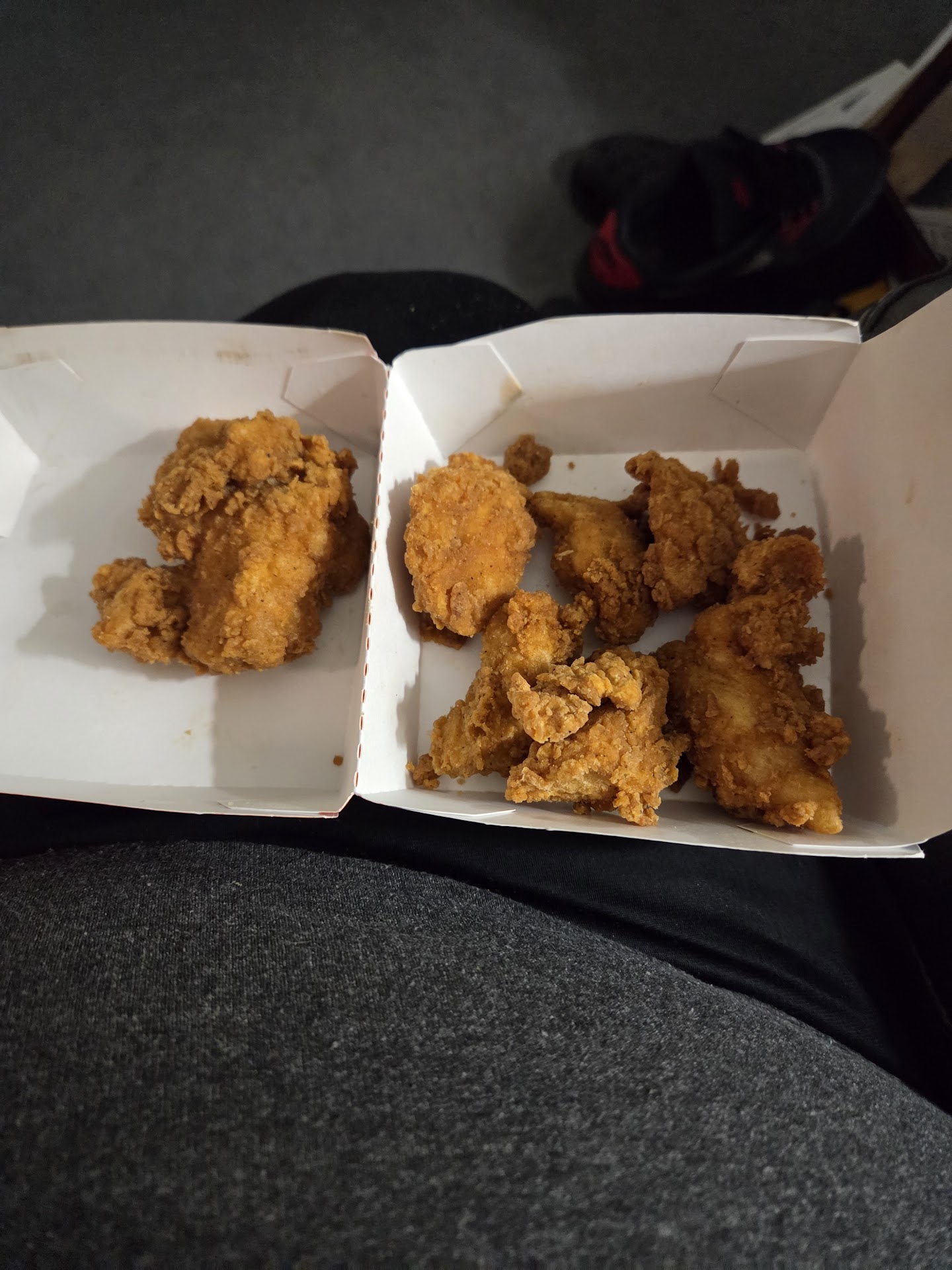 This happened 5/18. Arrived at the drive-thru at around 7:40pm. Waited several minutes for the vehicle (only one in the drive thru) to order, pulled up to order, waited several more minutes for someone to take my order. Waited 15 minutes for the car in front of me to pull away. Got to the window, paid for my order, then waited for my food. First got the drinks, 1 chocolate shake reg, that was correct, was handed a reg root beer float, I told the person that was incorrect, that it was supposed to be a large root beer cream shake, they then told me that I could keep it because they couldn't take it back once they handed it to me. At this point I should have checked my receipt. I clearly ordered a large root beer cream shake, but was only charged for a regular. After waiting for that to get corrected, they asked me if they had charged me for the food. I said yes. Waited some more and got a 3/4 full cream shake. Waited some more, they came back and asked why I was still there. I said, I didn't get my food. They acted shocked (same person this whole time) and asked again if I had paid for my food. Finally get my at 8:10pm. I am beyond unhappy at this point and drive off. Not realizing they did not give me the driver for my daughter's kids meal. I glanced over, saw three drink containers and took off. I have attached a pictures of what they considered a 5 piece chicken tenders. The one on the left is the only piece bigger than a nugget sized piece of chicken. Also, the chicken was stone cold by the time I got home 5 minutes later. Nothing like being charged $11 for cold leftover pieces of chicken tenders. I am sure I was not the only one that had a bad experience last night, as there were several people that looked annoyed waiting in the restaurant. While I was in line waiting, I watched one employee spend the entire time I was there stocking drink lids and another just standing around drinking soda or some other drink that they...