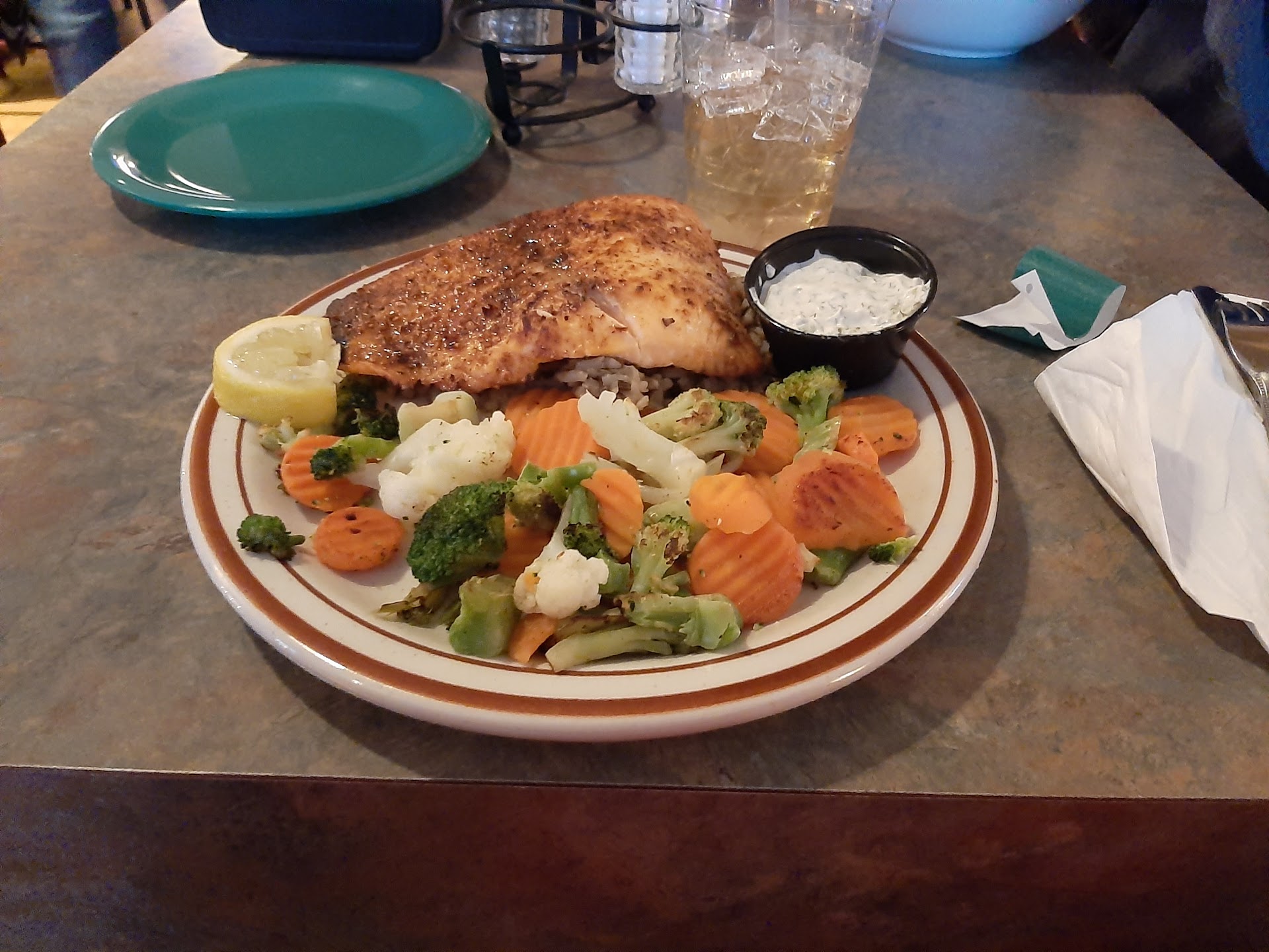 We also tried the applewood baked salmon — first bite had a surprising kick (thought it was Cajun!), but the manager confirmed it was just the seasoning. The heat faded after a few bites and ended up being pretty tasty.