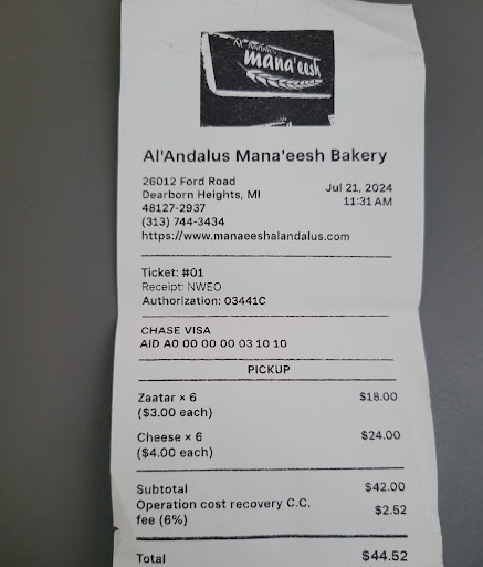 Read moreReminds me of when Golden Bakery and Yasmeen bakery use to make their food back from the 90s and early 2000s, which use to be really good and authentic, but not anymore. At those places, you have to ask per request for the food to come out of the oven. That's not cool. The food at Al Andalus taste as fresh as the Lebanese make them back home in Lebanon. No nonsense, and made fresh out of the traditional oven.The bakery food is not pre-made to satisfy a huge crowd needing to be in and out immediately, however it only takes a few minutes to get fresh food, which is great. Under 5 minutes for sure. My wife loved the food too. Happy wife, happy life. ;) I'm definitely...