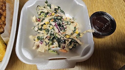As far as how everything tasted.... the rib was so tender, jucy and flavorful! Literally fell off the bone! No knives were used during me eating any of this! Lots of napkins, but no knives! The corn bread was soft and moist, with lots of flavor. The beans got better and better with every bite! The mac and cheese, was a cut above other mac and cheese! You could tell this was house made! Now the coleslaw.... to be fair I hate the stuff. All those Ruben sandwiches... you just ruin great sandwiches by adding the stuff, in my opinion. So I figured I would try a bite and then throw it away.... welp I was sorely mistaken! At first look, it barely looks like what I imagine when I hear "coleslaw " there is some corn and I discovered after like my mouth bite parmagrante seeds in there too! And the use of what I can only guess is their spicy mayo made this a coleslaw I will eat from here on out!