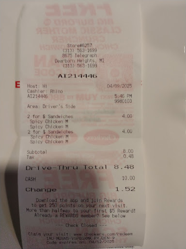 Read moreI have never been to a more tidy Checkers. I hate sloppy fast food burgers. Buns falling off, too much sause, collected too much grease. I almost never complain, it's fast food, if I wanted better I should go to a coney island. Every single time we order from THIS checkers our burgers are perfect. Perfect amount of everything. Even the way they fold the paper over your sandwich and it be tucked in so neat. And when you get something special done to the burger they fold it in some kind of origami fast food where the paper on top has a white fold so they can write on it. We later found out they had new owners and now they're Asian. I thought it was strange at first. An Asian family with a burger joint. The way they make this food now... Fast and perfect. I wish this family had more fast food locations. When we order from here, our food is always perfect and exactly what we ordered. But when you order don't use the order online directly from they're website. I ordered food from there and never got it and couldn't find a way to get a refund. So, always go straight...