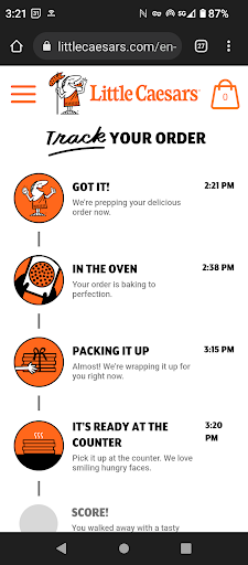 So I decide to get pizza before finishing moving in things, go to little Caesars about 5-10 mins after they open. I go in, there's one person waiting already for their order and someone ordering in front of me. Once I get up there I get up to front counter employee #1 (FCE1) and I order one extra most bestest and an icb. FCE1 says it'll be about 15-20 mins, Give him my name and wait outside. Seeing the customer that ordered in front of me from my car, using that customer as a reference when to go in. As I see that customer leave, about 20 mins later I walk in, at this point there about 4 people not including myself in the waiting area. I stand in line and the customer in front of me orders $80 dollars worth of food, so it was lil wait, then I ask about my food. Front Counter Employee #1 (FCE2) say they'll check and comes back and it's about to be out. I step aside. From the position I'm in I can see the oven now, I see an icb (which I assumed was mine, and the Oven Employee (OE) taking out a pizza out the oven. I watch him take out, cut, and box about six when FCE2 comes up to me and tells me they never put my order in, and it'll be about 5-6 more mins. I asked how that happens and mentioned I have already been waiting for a half our at this point and he gives me a free 2 liter for my wait.i go back to my position and watch the OE continue to take out, cut, and box 10 more pizzas, as all of them (all 16) are still just out on the counter with the icb. Once the wings started coming out he boxed a couple and put a set of wings with the icb in the hotbox and start movie all the pizzas in. At this point I'm a bit relieved, thinking that icb is with that order since it's been just sitting out through 16 pizzas being cut. Then as OE is still boxing up wings FCE2 pulls my pizza out thr oven and gets it ready, then goes into that hotbox and grabs that icb thats been just sitting out the whole time. At this point I just want to leave, even though I know that it's not going to be hot. Take my order, FCE2 apologizes again and I leave. I live less than a mile away from little Caesars, get home and confirm that the icb is Luke warm at best and the extra most bestest just kinda thrown together. Parts of the slices missing cheese, some pieces with barely any pepperoni. (reason I got the extra most bestest)