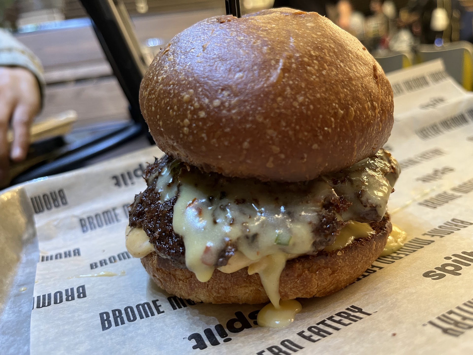 We ordered a Vegamami Burger, an Impossible Burger, and a Double-Stack Burger with drinks and fries. The drink machine was overflowing with water, and there was water all over the ground near the machine.