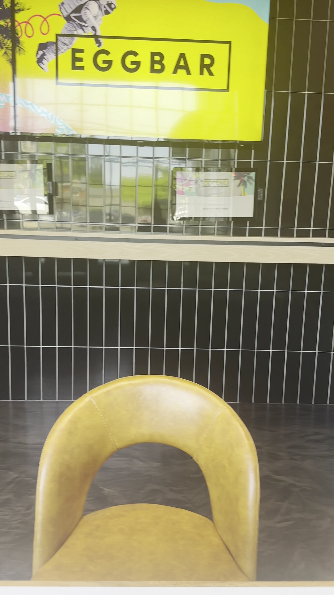 Pop, neon, and houndstooth; "Egg Bar" printed in mocha dust a top coffee foam; 2000's dream pop whimsy; Shangri-La haven for Instagram zealots.
