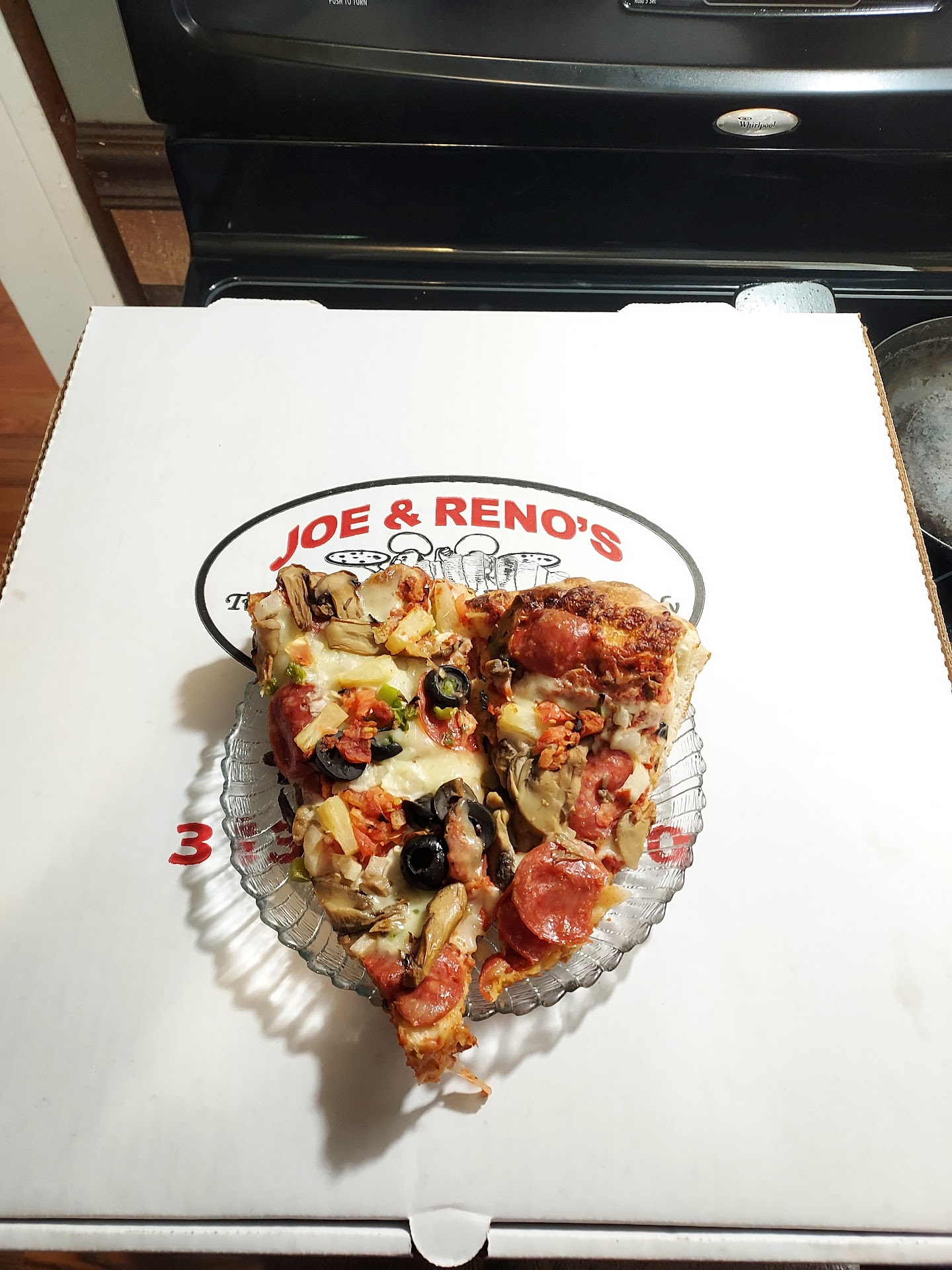 Read moreDearborn is blessed to have a healthy variety a family-owned pizzerias in town that hold the chains at bay more than other towns in metro Detroit. Joe & Reno's is one of those long-running neighborhood carry out pizza joints that seems to still be going strong. I ordered a combo deal that included a large pizza with two toppings, garlic bread sticks and a salad for $16.99 ($18.01 out the door w/tax). It was a Friday during Lent, so my pizza had onions and black olives. I usually ask for extra sauce on the pizza, since they don't put a lot on their pies. Cheese and toppings are pretty generous. The garlic bread sticks are long, thin strands, in contrast with what you get at the chains, and come with their tomato sauce for dipping. The salad comes with sliced tomato, unsliced black and green olives, and peppercinis-- along with your choice of dressing envelopes. Overall, Joe & Reno's provides good but not exceptional food at a...