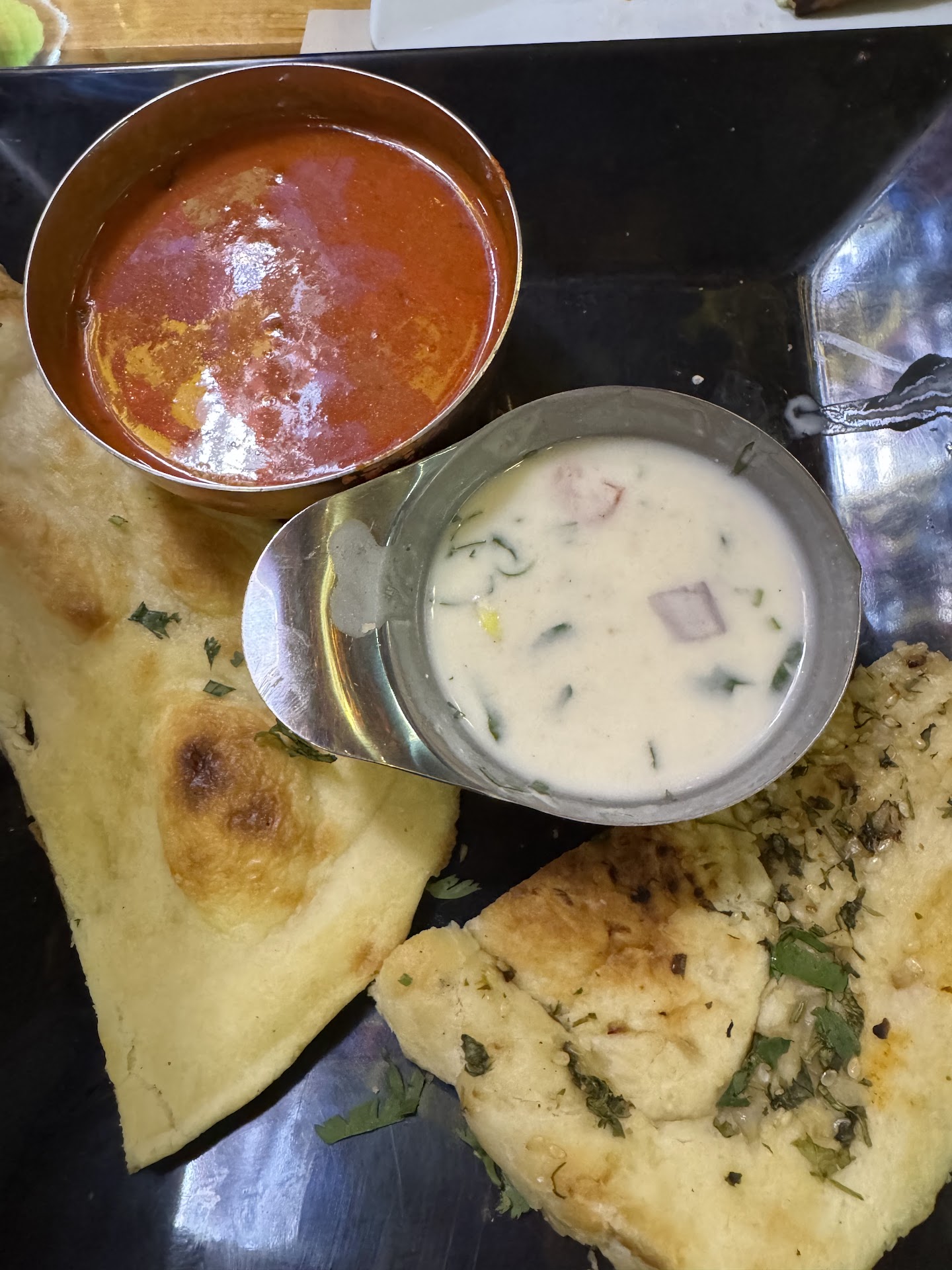 Food & Drinks: The menu is creative, with some standout dishes, but not everything lived up to expectations: • Naan Appetizer: This comes with a variety of sauces. While the naans are usually plain, they made an exception and served both plain and garlic naan, which we appreciated. We originally ordered it with cilantro hummus, but it was bland and lacked cilantro flavor. We swapped it for the butter sauce, which was rich and delicious. • Raita: Unfortunately, the raita was overly liquidy, with finely chopped tomatoes, cucumbers, and onions. It seemed more like a chaas base, which ironically wasn’t available. • Paneer Bhurji Pizza: A highlight! The flavors were bold and creative, though cheddar cheese felt out of place for Indian fusion. Still, the combination worked well and is worth trying. • Pani Puri: This was an interesting twist with fryum-style puris and chickpea salsa chaat filling. The pani water was flavorful, but traditionalists may find it less authentic. • Masala Lemonade: Refreshing and highly recommended! • Pomegranate Drink: We tried ordering several drinks from the menu (like lassi and masala chai), but many weren’t available. We ended up with a pomegranate-based drink that was good but unremarkable.