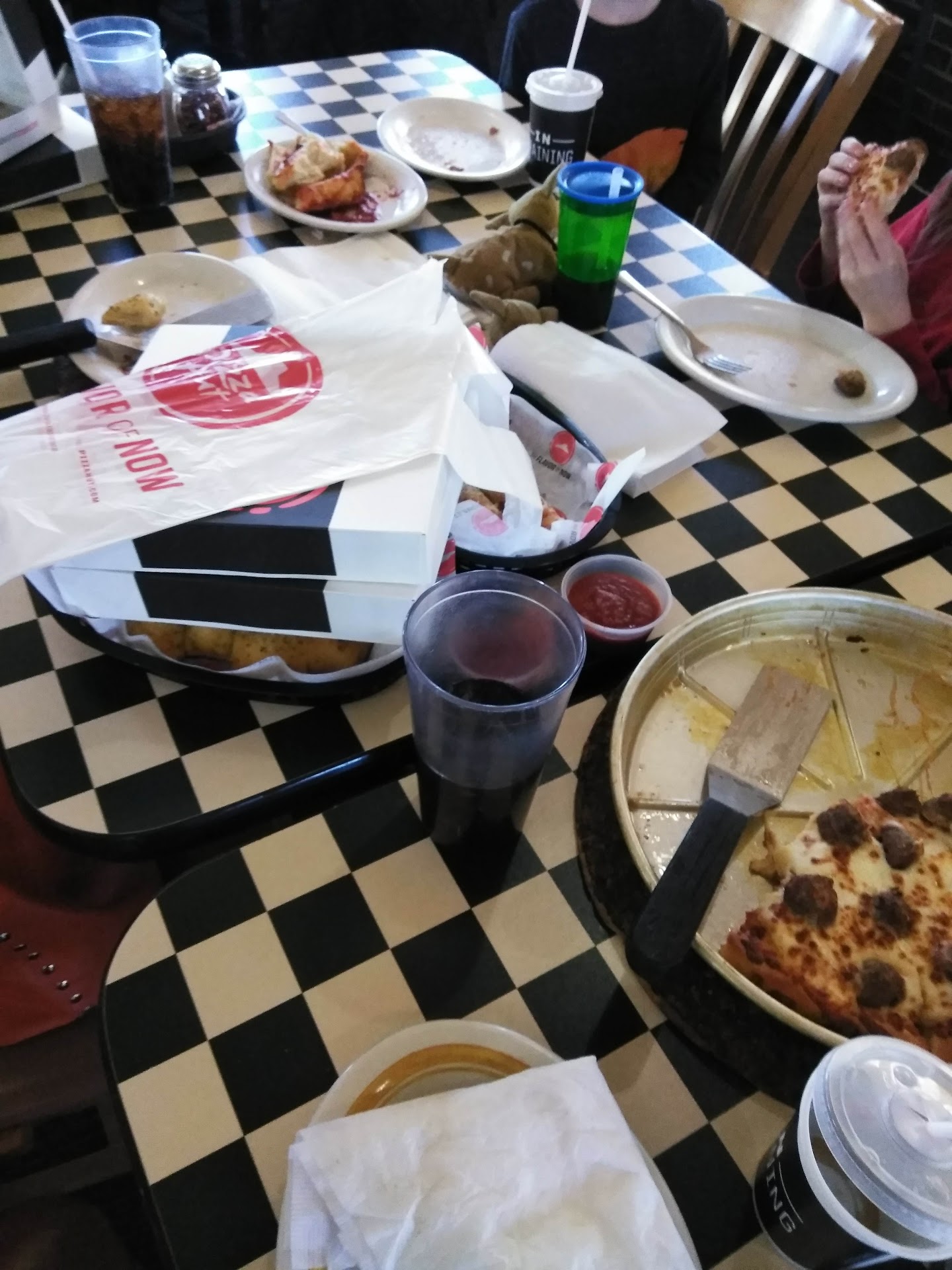 BIG negatives: 4 of 5 of us wanted personal pizzas. After ordering a few minutes later Alyssa came back and told us they we're out of personal pizzas (again! this happens quite often). Normally we could just ask for a large pepperoni pizza and be good with it. This time I had a friend with my family, and her son. Our boys are 7 and extremely picky eaters. Maybe we should have left, but that is hard on our boys too, so we stayed.